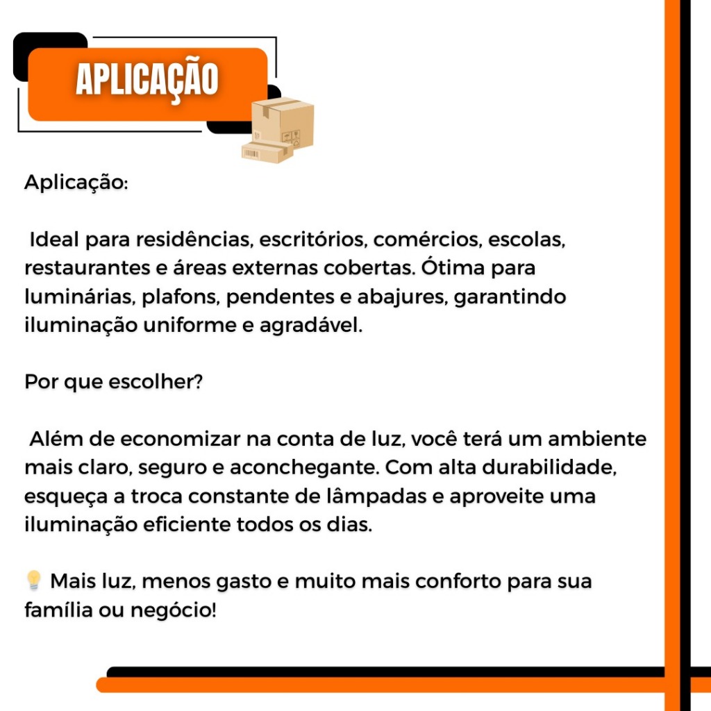 Descrição do Produto Renove a iluminação da sua casa ou negócio com o Kit 10 Lâmpadas LED Bulbo 9W 6500K Bivolt. Perfeitas para quem busca economia, qualidade e claridade intensa, essas lâmpadas oferecem luz branca fria de 6500K, garantindo um ambiente mais iluminado e confortável para o dia a dia. Características: Potência: 9W (equivale a ~60W incandescente) Temperatura de cor: 6500K (luz branca fria) Tensão: Bivolt automático (110V/220V) Base: E27 (compatível com soquetes padrão) Fluxo luminoso: aprox. 806 lúmens Economia de energia: até 85% em comparação a lâmpadas incandescentes Vida útil: até 25.000 horas Material: policarbonato resistente com dissipador de calor Acendimento instantâneo e sem aquecimento Não emite raios UV (não atrai insetos e não desbota objetos) Aplicação: Ideal para residências, escritórios, comércios, escolas, restaurantes e áreas externas cobertas. Ótima para luminárias, plafons, pendentes e abajures, garantindo iluminação uniforme e agradável. Por que escolher? Além de economizar na conta de luz, você terá um ambiente mais claro, seguro e aconchegante. Com alta durabilidade, esqueça a troca constante de lâmpadas e aproveite uma iluminação eficiente todos os dias. 💡 Mais luz, menos gasto e muito mais conforto para sua família ou negócio!