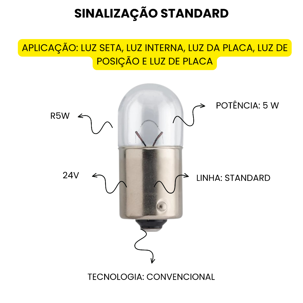 SINALIZAÇÃO E LUZ INTERNA PARA CAMINHÕES A LÂMPADA STANDARD PARA SINALIZAÇÃO E LUZ INTERNA É USADA PELOS PRINCIPAIS FABRICANTES E VOCÊ PODE ENCONTRÁ-LA NA MAIORIA DOS CAMINHÕES NOVOS. GARANTE EFICIÊNCIA, QUALIDADE E ÓTIMA RELAÇÃO CUSTO-BENEFÍCIO. * SEGURANÇA * QUALIDADE DE EQUIPAMENTO ORIGINAL APLICAÇÃO: - LUZ DE SETA - LUZ INTERNA - LUZ DE PLACA - LUZ DE POSIÇÃO - LUZ DE FREIO * DESIGNAÇÃO: 13821CP * LINHA: STANDARD * TECNOLOGIA: CONVENCIONAL * INSERIR: R5W * BASE: BA15s * HOMOLOGAÇÃO ECE: SIM * VOLTAGEM: 24 VOLT * POTÊNCIA: 5 W CONTEÚDO DA EMBALAGEM: 10 - LÂMPADAS R5W 24V