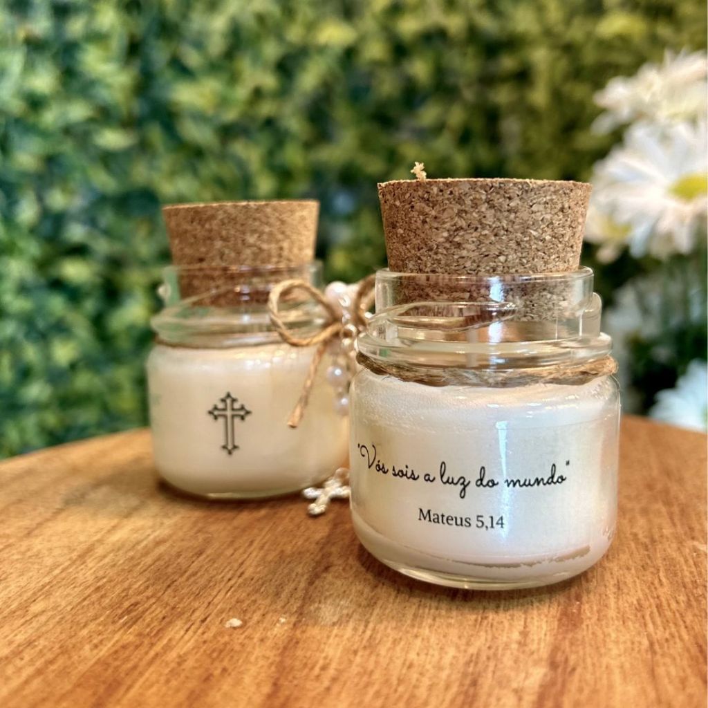 KIT 10 VELAS PERSONALIZADAS PARA MATERNIDADE, BATIZADO, CASAMENTO, ANIVERSÁRIO Transforme suas celebrações em momentos inesquecíveis com nosso Kit de 10 Velas Personalizadas. Ideal para maternidade, batizado, casamento ou aniversário, cada vela é uma experiência única e especial! Características das Velas As velas são confeccionadas com cera vegetal de alta qualidade, garantindo uma queima limpa e prolongada. Com essência de alta concentração, você pode escolher o aroma que mais combina com seu evento, entre as opções como Baby, Flor de Laranjeira, Limão Siciliano, Lavanda, Bambu e Alecrim. Cada vela vem embalada em um elegante frasco de vidro com tampa de rolha de cortiça, adornado com um delicado laço de rami e um mini terço branco. Um toque especial que encanta a todos! Dimensões: - Altura: 6 cm - Diâmetro: 4,5 cm - Peso: aproximadamente 80g Personalização Você pode personalizar as etiquetas como desejar! Basta entrar em contato conosco após a compra. *obs: não colocamos nomes indivduais nas velas ** por se tratar de um kit nos montamos ate duas artes diferentes para cada compra Lembre-se: caso não envie as informações de personalização em até 24 horas, seu pedido será enviado sem personalização. Prazo de Produção e Envio Por se tratar de um produto personalizado, nosso prazo de postagem é de 3 dias úteis. Após a compra, envie os dados para a personalização e aguarde nossa confirmação. Como e Quando Receber Seu Pedido Nossas velas são enviadas para todo o Brasil via shopee xpress. O prazo de entrega será informado ao adicionar o produto ao carrinho. Faça seu pedido agora e encante seus convidados com nossas velas personalizadas cheias de amor e carinho!