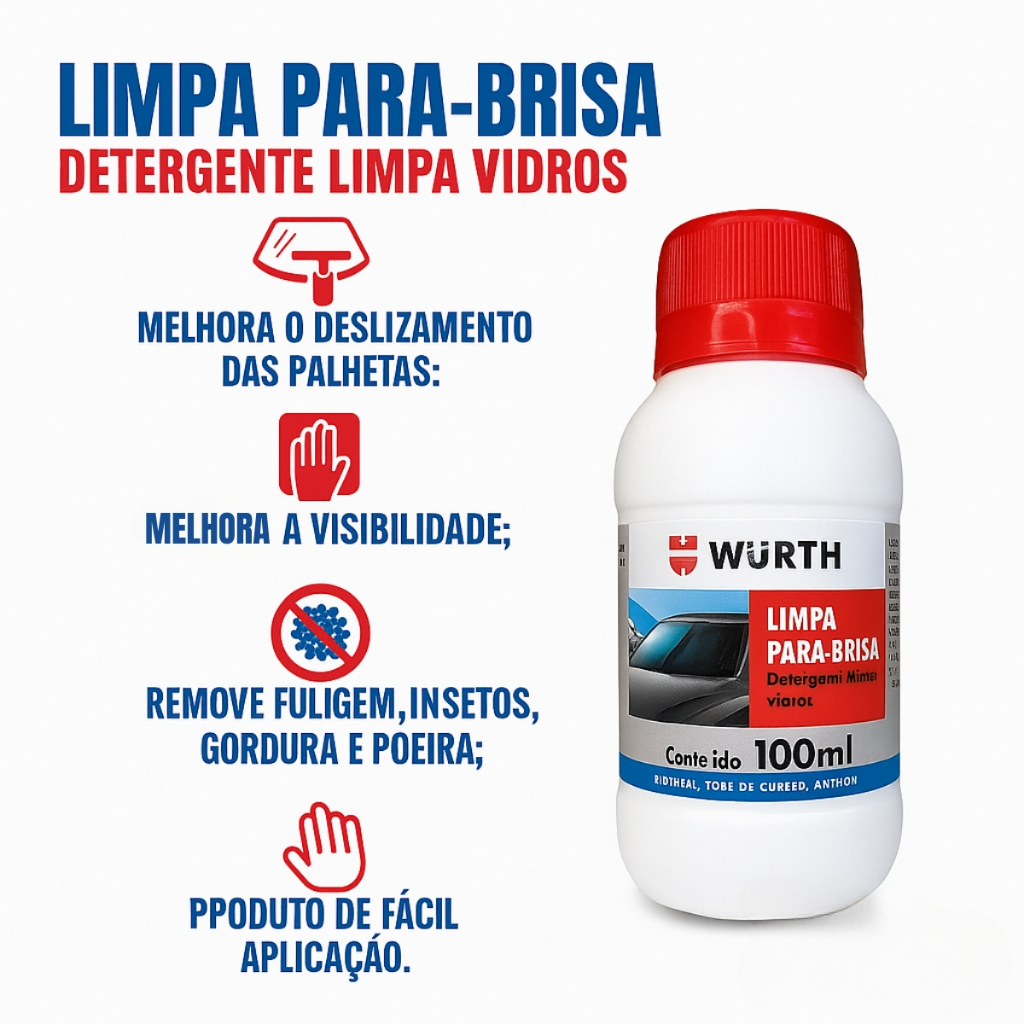 Kit 10 Limpa Parabrisa Concentrado Wurth 100ml – Visibilidade Perfeita e Proteção para o Sistema! O Limpa Para-brisa Concentrado Wurth é a solução ideal para manter seu para-brisa sempre limpo, sem manchas, gordura ou resíduos. Com fórmula altamente concentrada, o frasco de 100ml rende até 25 litros de solução pronta, garantindo economia e eficiência. Além da limpeza profunda, o produto protege o sistema de esguicho e as borrachas do limpador, evitando entupimentos e aumentando a vida útil das palhetas. Pode ser usado em qualquer tipo de veículo e é compatível com reservatórios de água dos limpadores. Benefícios: - Remove sujeiras, gordura, insetos e fuligem - Fórmula concentrada: rende até 25L - Evita manchas e riscos no vidro - Protege o sistema de esguicho e borrachas - Seguro para pintura e peças plásticas Conteúdo: 100ml Indicado para: Carros, caminhões, vans, motos e utilitários Qualidade e confiança da marca Wurth, líder em produtos automotivos! ____________________________________________________________________________ DÚVIDAS FREQUENTES: 1. Qual o prazo de envio? R: Todos os nossos produtos são postados em até 24 horas após a venda. Caso deseje uma estimativa de entrega, você pode clicar em comprar e informar seu CEP de entrega. Se preferir, pode simplesmente não confirmar a compra. 2. O produto acompanha Nota Fiscal? R: Sim, todos os nossos produtos acompanham Nota Fiscal. Certifique-se de que seu cadastro e endereço de entrega estão corretos antes de efetuar a compra. 3. Emitimos nota fiscal para CNPJ? R: Sim, emitimos nota fiscal tanto para Contribuintes quanto para Não Contribuintes. 4. Os produtos são Novos e possuem Garantia? R: Sim, todos os produtos são novos e contam com garantia fornecida pelo Fabricante. 5. Caso o produto não seja entregue, meu pagamento será ressarcido? R: Garantimos os envios por meio das empresas com as quais trabalhamos, o que assegura o ressarcimento em casos de não entrega. Ficamos à disposição para qualquer outra dúvida no campo de perguntas.