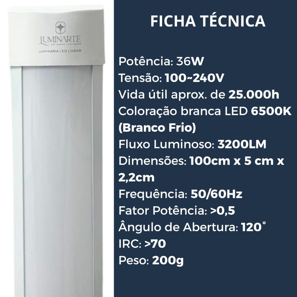 Kit 10 Luminária Tubular Led Slim 36w Sobrepor 100cm Bivolt Branco Frio 6500k (LUZ BRANCA) - LUMINARTE