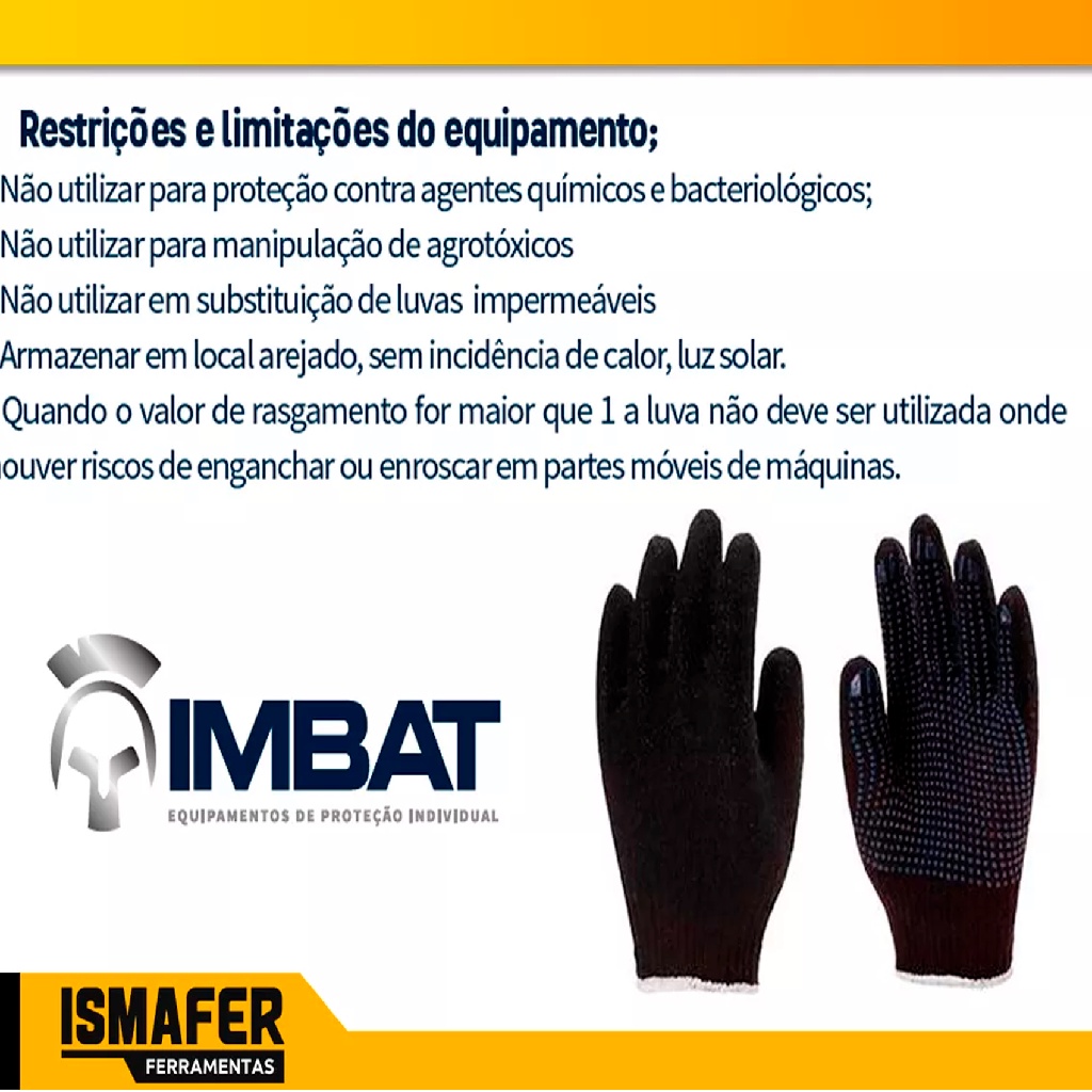 Distribuído por Ismafer Ferramentas 10 UNI LUVA TRICOTADA PRETA LEVE COM PIGMENTO - LV-APL-P1-9 1 Par de Luvas de Proteção Leve Tricotada Confeccionada em 2 Fios de Algodão na Cor Preta | Pigmento na Palma em PVC, Confere Maior Aderência em Atividades com Objetos Secos e Lisos | Punho com Acabamento em Elastâno e Costuras Overlock | Antiderrapante na Palma | Proteção para Serviços Gerais | Formato Anatômico com Redução da Fadiga Muscular. 1. Indicação da Proteção que o EPI oferece: Indicada para riscos mecânicos – proteção contra agentes abrasivos e escoriantes, Risco Mecânico, Objetos Cortantes e Perfurantes. 2. Instruções sobre o uso, armazenamento, higienização e manutenção corretos; - O produto deve ser armazenado em ambiente com temperatura média de 23 graus Celsius e Umidade relativa de 55%. - O produto deve ser armazenado em condições em que não ocorra Incidência de raios UV sobre o produto. As luvas poderão ser lavadas com substâncias neutras. - A secagem do produto deverá ser efetuada a sombra . - O produto não deverá ter secagem forçada em fornos e outros equipamentos que produzem calor extremo. - O fabricante aconselha, para a maior durabilidade adotar o uso alternado da luva destinada ao mesmo campo de uso, deixando o produto em período de dois dias de intervalo entre trocas, para que ocorra a dessorção natural de umidade e de outras substâncias absorvidas. - Não alvejar com branqueadores ou clarificadores. - Produto constituído de látex com validade no produto. SKU: KIT22463-10 Distribuído por Ismafer Ferramentas
