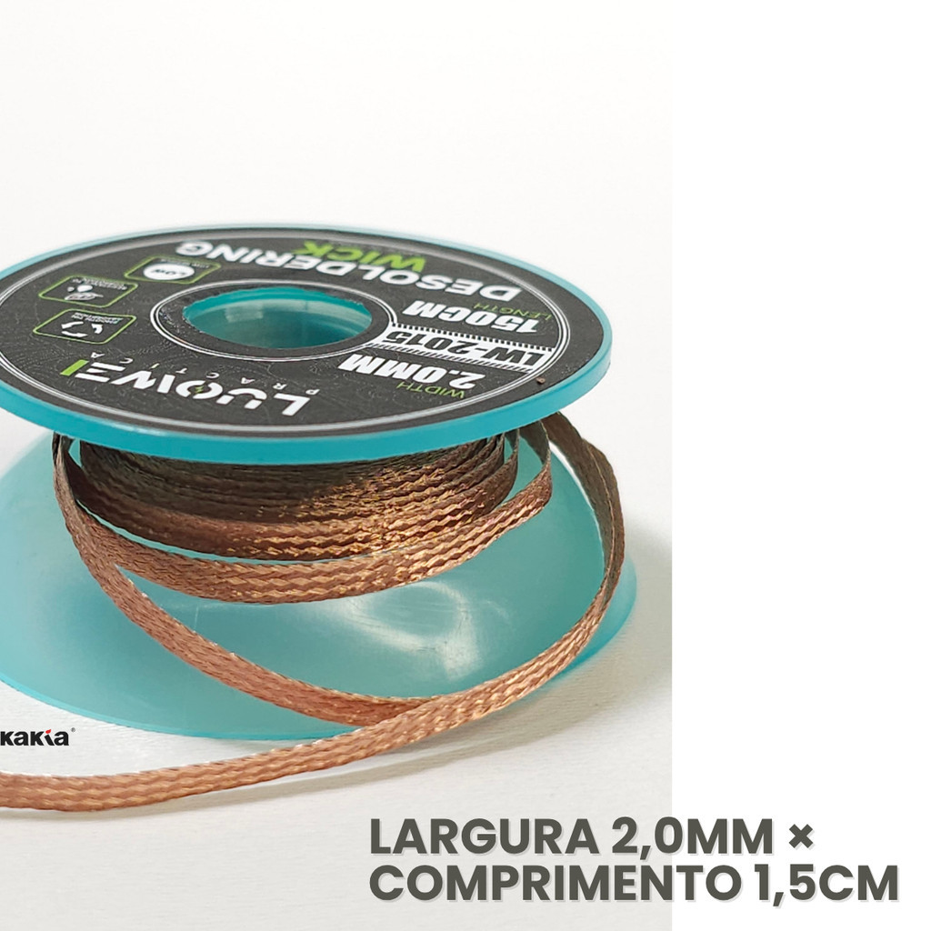Kit com 10 malhas dessoldadoras Luowei LW-2015 2,0 mm x 1,5 m para retrabalho profissional em placas PCB de celulares, notebooks, videogames e eletrônica, garantindo remoção rápida de estanho com acabamento limpo. Características do produto: – Kit com 10 rolos de malha dessoldadora Luowei LW-2015 – Cobre trançado de alta pureza para melhor capilaridade e absorção do estanho – Largura de 2,0 mm e comprimento de 1,5 m por rolo – Embalagem tipo tubo, prática para armazenamento e organização na bancada – Indicado para retrabalho de solda em placas PCB de celulares, notebooks, consoles, TV box e eletrônica em geral – Compatível com retrabalho em SMD, BGA, limpeza de excesso de solda e remoção de pontes indesejadas Benefícios: – Reduz o tempo de aquecimento sobre a placa, diminuindo o risco de danificar trilhas sensíveis – Proporciona dessoldagem limpa e controlada, com acabamento profissional em menos tempo – Aumenta a produtividade em bancadas que utilizam malha dessoldadora diariamente – Facilita a recuperação de pads oxidados ou com excesso de solda – Oferece excelente custo-benefício para assistência técnica, laboratórios e hobbystas avançados Modo de uso rápido: Posicione a malha dessoldadora sobre o ponto de solda que deseja remover. Encoste a ponta do ferro de solda aquecido sobre a malha, em cima da solda. Aguarde alguns instantes para que o estanho derreta e seja puxado pela capilaridade do cobre trançado. Retire a malha e verifique se a área ficou limpa; repita o processo se necessário com um trecho novo da fita. Descarte a parte da malha saturada e mantenha os rolos guardados em local seco para preservar o desempenho. Especificações técnicas: – Marca/modelo: Luowei LW-2015 – Tipo de produto: malha dessoldadora para retrabalho de solda – Quantidade no kit: 10 rolos – Largura de cada malha: 2,0 mm – Comprimento de cada malha: 1,5 m – Material: cobre trançado de alta pureza – Aplicação: retrabalho em SMD/BGA, limpeza de excesso de solda, remoção de pontes e recuperação de pads Conteúdo da embalagem: – 10x Malhas dessoldadoras Luowei LW-2015 2,0 mm x 1,5 m em embalagem tipo tubo