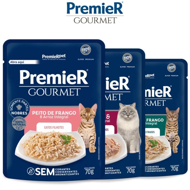 | Kit 10 ou 20 Sachês Premier Gourmet Gatos Castrados Atum, Peito de ... este produto | R$ 99,90 | — | 5.0/5 | 42 |
