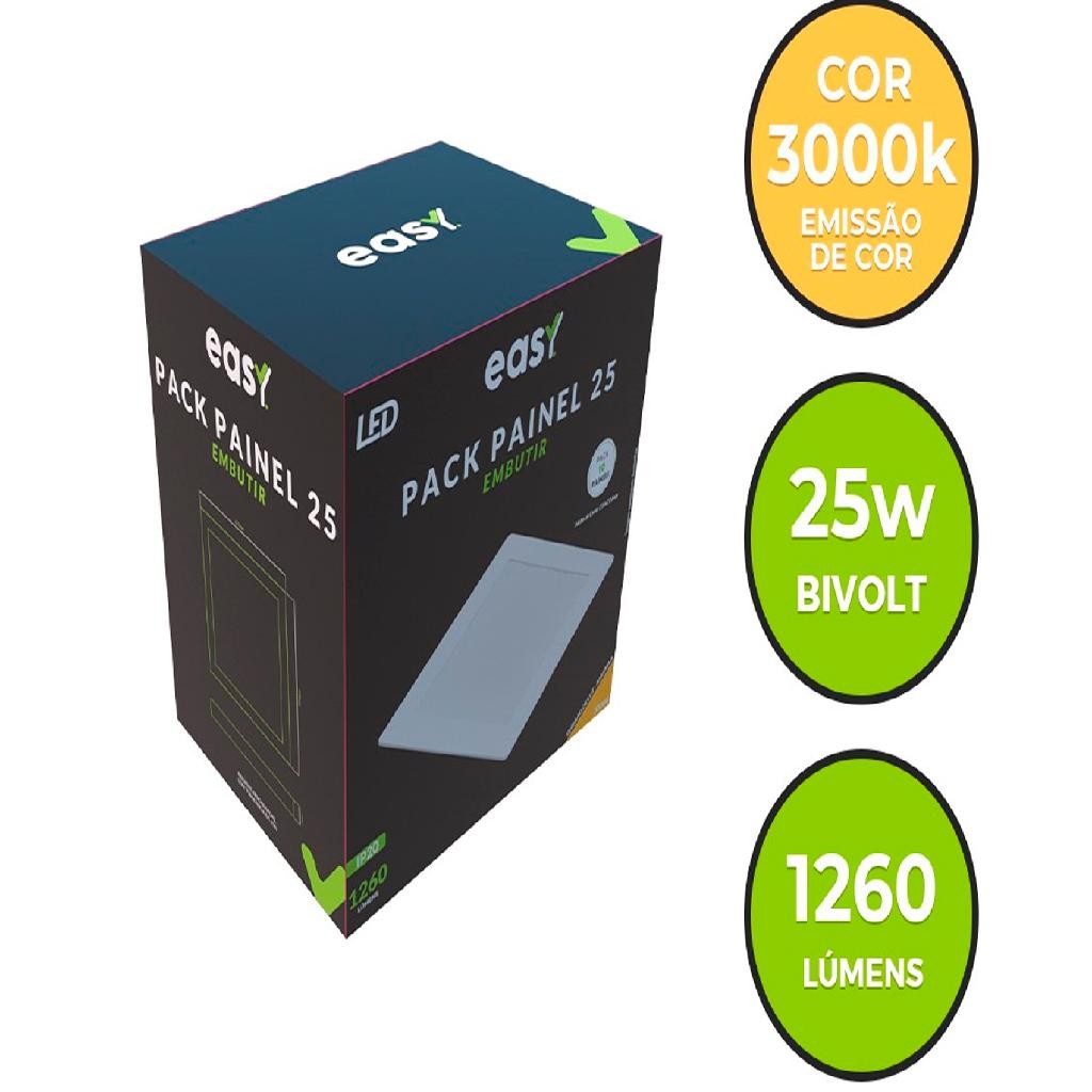 Distribuído por Ismafer Ferramentas Painel Easy: 10 unidades Ideal para iluminação interna de ambientes residenciais, comerciais ou corporativos. - Propriedades: - Construção livre de mercúrio. - Painel com acabamento em policarbonato na cor branco. - Baixo consumo de energia. - Características de Funcionamento: - Tensão nominal: 100V a 240V (BIVOLT) - Fator de potência: >0,50. - Baixo consumo de energia. - Tipo de Instalação: Embutir. - Características: - Temperatura de Cor: 3000k | Branco Quente. - Não Dimerizável. - Ângulo de Abertura: 120°. - IRC**: 70. - Tipo de Uso: Interno. - Especificações Técnicas: - Cód. de Barras: 7899452031648. - Potência: 25W. - Tensão: 100V - 240V Bivolt. - Fluxo Luminoso: 1260Im. - Eficiência Luminosa: 70 lm/W. - Peso: 226g. - Dimensões: C = 286mm | L = 286mm | A = 25mm. - Garantia: A garantia inicia-se na data da compra do produto, desde que sejam respeitadas as condições de uso descritas na embalagem, sendo necessário apresentar o Cupom ou a Nota Fiscal. - Sobre o Produto: Sua compra vai com 10 unidades do Painel plafon led 3000k bivolt. - Sobre a Marca: Conheça a EASY - uma marca inovadora que une tecnologia de ponta à economia, sem abrir mão da qualidade. Nossos produtos são projetados para simplificar sua vida, oferecendo o máximo em eficiência e economia. Com valores justos, a EASY torna a experiência tecnologia acessível a todos. Experimente a excelência em cada detalhe - escolha EASY. SKU: 23962 Distribuído por Ismafer Ferramentas