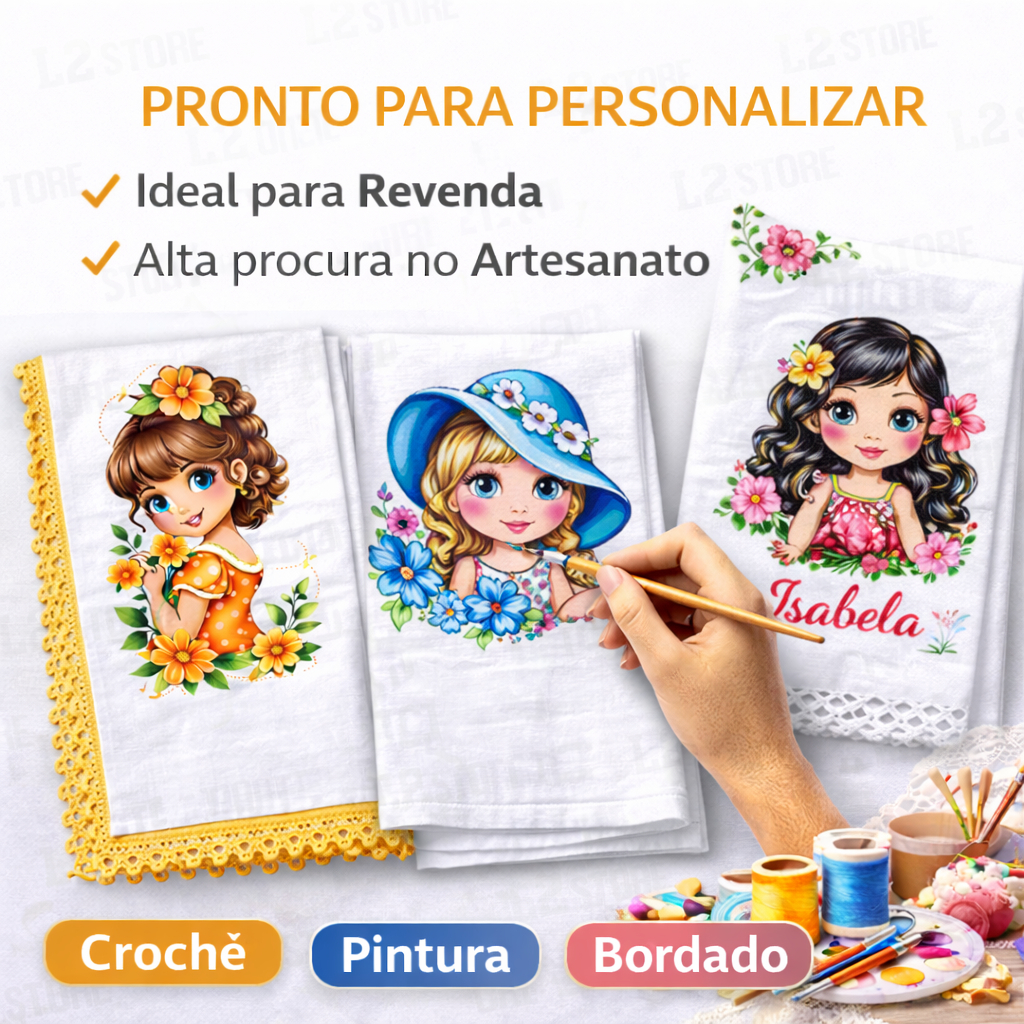 KIT COM 10 PANOS DE PRATO BONEQUINHAS 45X70 CM 100% ALGODÃO PREMIUM Deixe seus trabalhos artesanais ainda mais lindos com panos de prato grandes, macios e prontos para receber pintura, aplicações e saia de crochê ou tecido. DESTAQUES - Tecido 100% algodão: toque suave, sem aspereza - Tamanho grande 45 x 70 cm: mais espaço para criar e decorar - Estampa de bonequinha: ideal para aplicação de saia (crochê ou tecido) - Bainha nas laterais com costura reforçada - Produto revisado antes do envio IDEAL PARA - Artesanato e decoração - Pintura em tecido - Aplicação de barrados e saias - Uso diário na cozinha com mais charme O QUE VOCÊ RECEBE - 10 panos de prato estampados (bonequinhas) INFORMAÇÕES IMPORTANTES - Estampas e cores enviadas SORTIDAS, conforme disponibilidade do estoque da loja - Composição: 100% algodão