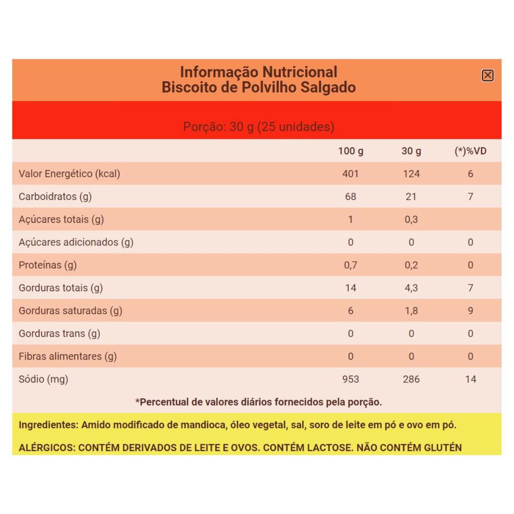 Polvilho Cassini Sal (100g, 200g, 40g) - Ingredientes: Polvilho, gordura vegetal hidrogenada, sal, ovo em pó, soro de leite em pó, farinha integral de soja. Alergênicos: Contém derivados de ovo, leite e soja. Contém lactose. Não contém glúten. ***As informações apresentadas por aqui podem ser genéricas e/ou não especificadas por sabor. Para validá-las, consulte sempre o rótulo ou canal oficial do fabricante.
