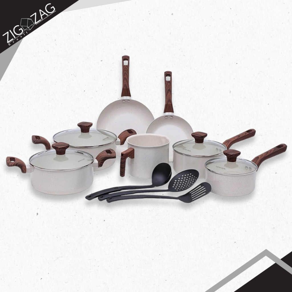 Recomendação da Loja O Conjunto de Panelas com 10 Peças Indução Crema Cook é composto por itens essenciais para uma cozinha completa e prática. Com revestimento antiaderente, proporciona cozimento uniforme, fácil limpeza e alta durabilidade. Ideal para quem busca qualidade e desempenho. É compatível com fogões de indução, elétrico, a gás e vitrocerâmico, esse conjunto oferece versatilidade no preparo dos mais variados pratos. Suas tampas de vidro temperado com saída de vapor permitem o acompanhamento do cozimento sem perder calor. O Conjunto de Panelas apresenta um elegante acabamento. Com os cabos ergonômicos garantem conforto e segurança durante o manuseio harmonizando com diversos estilos de decoração, feito para todos os tipos de cooK Especificações: Material: Alumínio, Baquelite, Vidro Temperado, Aço Inox. Espessura: 2mm Cores: Crema, Marmol Peças e tamanho: Panela 1: 18 x 8cm - 2L Panela 2: 16 x 7, 5cm- 1,5L Leiteira: 14 x 12 - 2L Caçarola 1: 20 x 9 - 2,8L Caçarola 2: 22 x 9,5cm - 3,6L Frigideira 1: 22 x 4,1cm - 1,2L Frigideira 2: 18 x 3,8- 0,75L Concha: 30 x 8,7 x 7,5cm Espátula: 33 x 8,8 x 4cm Escumadeira: 33 x 5 x 11,6cm Muito obrigado por escolher a Zig Zag!