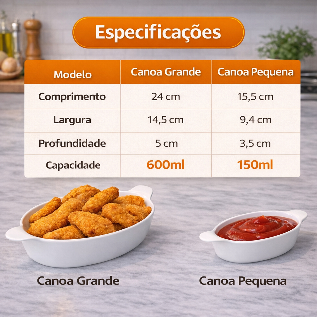 Kit de Petisqueiras Canoa – Praticidade e Versatilidade para Servir O Kit de Petisqueiras Canoa é ideal para servir petiscos com charme e organização. Com design moderno em formato de canoa e acabamento liso, ele valoriza a apresentação dos alimentos, seja em reuniões com amigos, festas, churrascos ou no dia a dia. Fabricadas em plástico resistente, as petisqueiras são leves, fáceis de manusear e simples de limpar, tornando o uso muito mais prático. O conjunto conta com dois tamanhos diferentes, perfeitos para combinar porções variadas e criar uma apresentação harmoniosa à mesa. Qualidades do Produto Material leve e resistente Fácil de lavar e secar Design moderno em formato canoa Ideal para servir petiscos, molhos, porções e acompanhamentos Perfeito para uso doméstico ou eventos Especificações Técnicas Canoa Grande Comprimento: 24 cm Largura: 14,5 cm Profundidade: 5 cm Capacidade: 600 ml Canoa Pequena Comprimento: 15,5 cm Largura: 9,4 cm Profundidade: 3,5 cm Capacidade: 150 ml