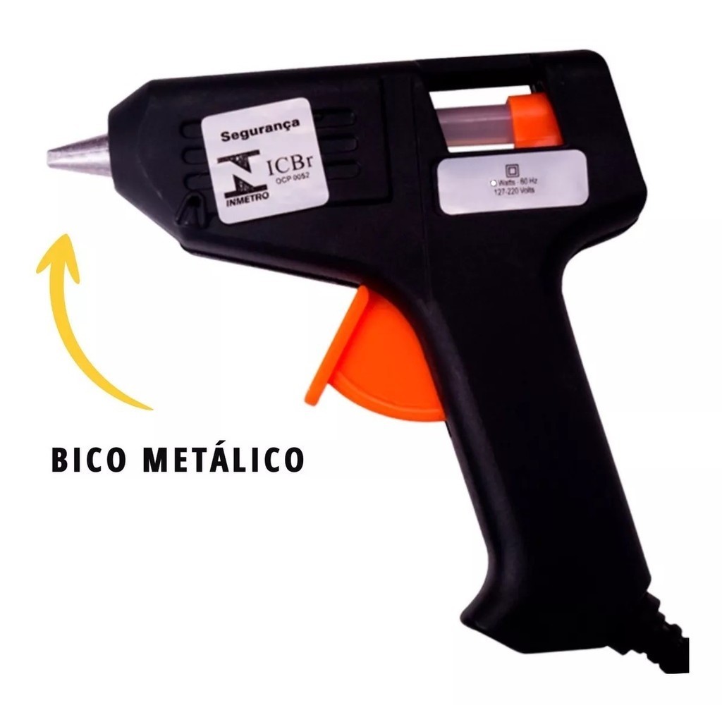 KIT COM 10 PISTOLAS Pistola de Cola Quente Pequena 20W Hai Brasil - 127-220 Volts para Cola Quente Fina APROVADA INMETRO Pistola De Cola Quente Bivolt 20w Bico Fino Bastão Máquina Papelaria Pequena Grande Trabalho Escolar Aquece A Pistola de Cola Quente Pequena é ideal para quem busca precisão e fácil manuseio na aplicação de cola quente em trabalhos manuais. Serve tanto para uso artístico quanto profissional.Esta Pistola para Cola Quente é aconselhável para trabalhos com papéis, EVAs, Massa para artesanato, madeiras leves, plásticos, bijuterias, flores artificiais, vidros pequenos, selagem de caixas de papelão, entre outras diversas formas de utilização.A Pistola é bivolt e tem potência de 20W.Possui cabo de 1m, o que proporcionará maior conforto na hora de utilizá-la e o seu aquecimento acontece entre 3 e 5 minutos. É extremamente rápido!Possui ótima durabilidade devido ao seu material, que é feito de plástico injetado (muito firme) e bico metálico. Pistola manual pequena (Hai Brasil 20W), para a aplicação do bastão de cola quente 7,5 mm fino. Ideal para colagem sob a superfície de materiais como: Tecido, madeira, vidro, plástico, metal, cerâmica entre outros. Rápido, fácil e versátil. INFORMAÇÕES TÉCNICAS: - Frequencia: 50/60 Hz- Potência Máxima: 20 W- Tipo: Pistola Pequena- Comprimento: 11,5 cm- Altura: 11 cm- Marca: Hai Brasil - Com suporte de descanso cromado- Use o bastão de cola quente 7,5 mm (fino)