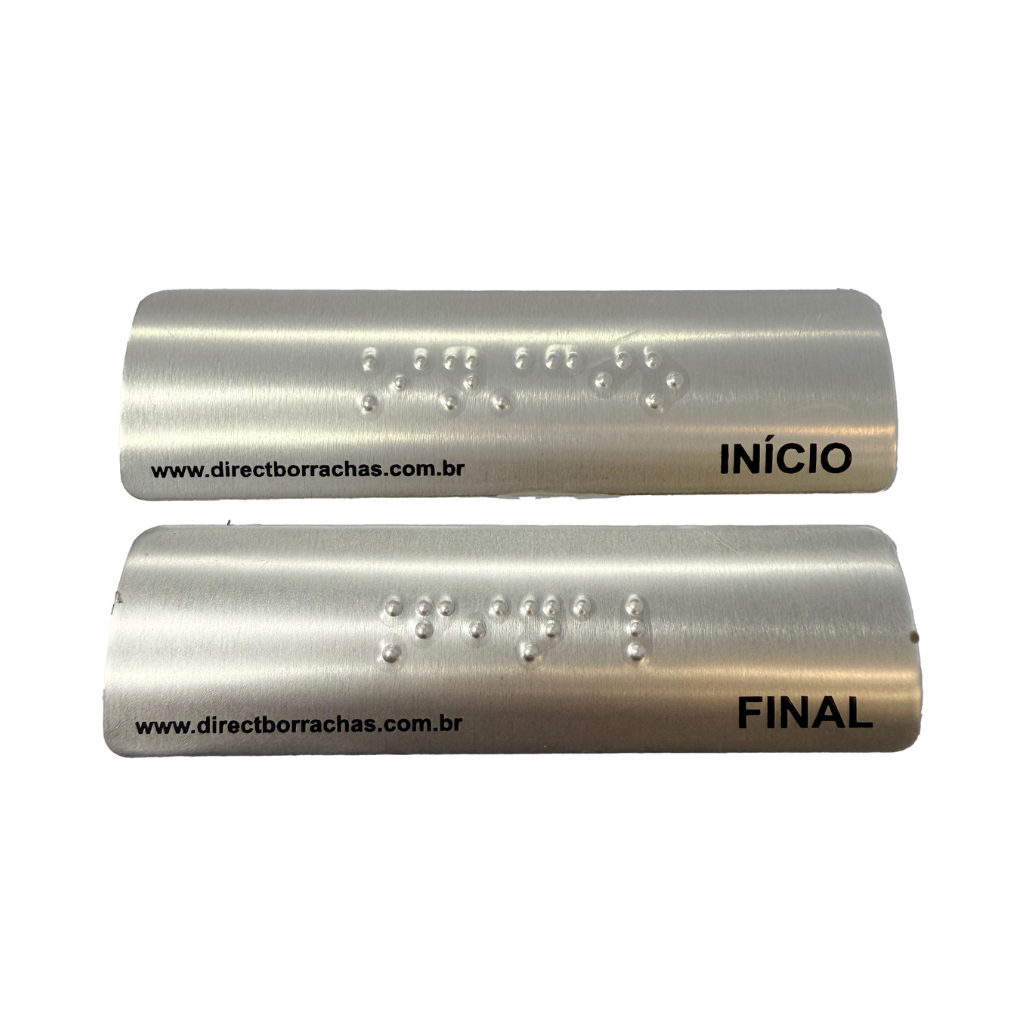 Placa Braille para Corrimão 10x3 cm Und. - Direct Borrachas A placa em braille para corrimão é fabricada seguindo a norma ABNT NBR 9050/2024. Kit: 5 placas modelo "final" e 5 placas modelo "início" Dimensão: 10x3cm Material: Alumínio Proteção: Película frontal transparente que pode ou não ser retirada Fixação: Fita dupla face 3M integrada ao verso das placas, pronta para instalação.