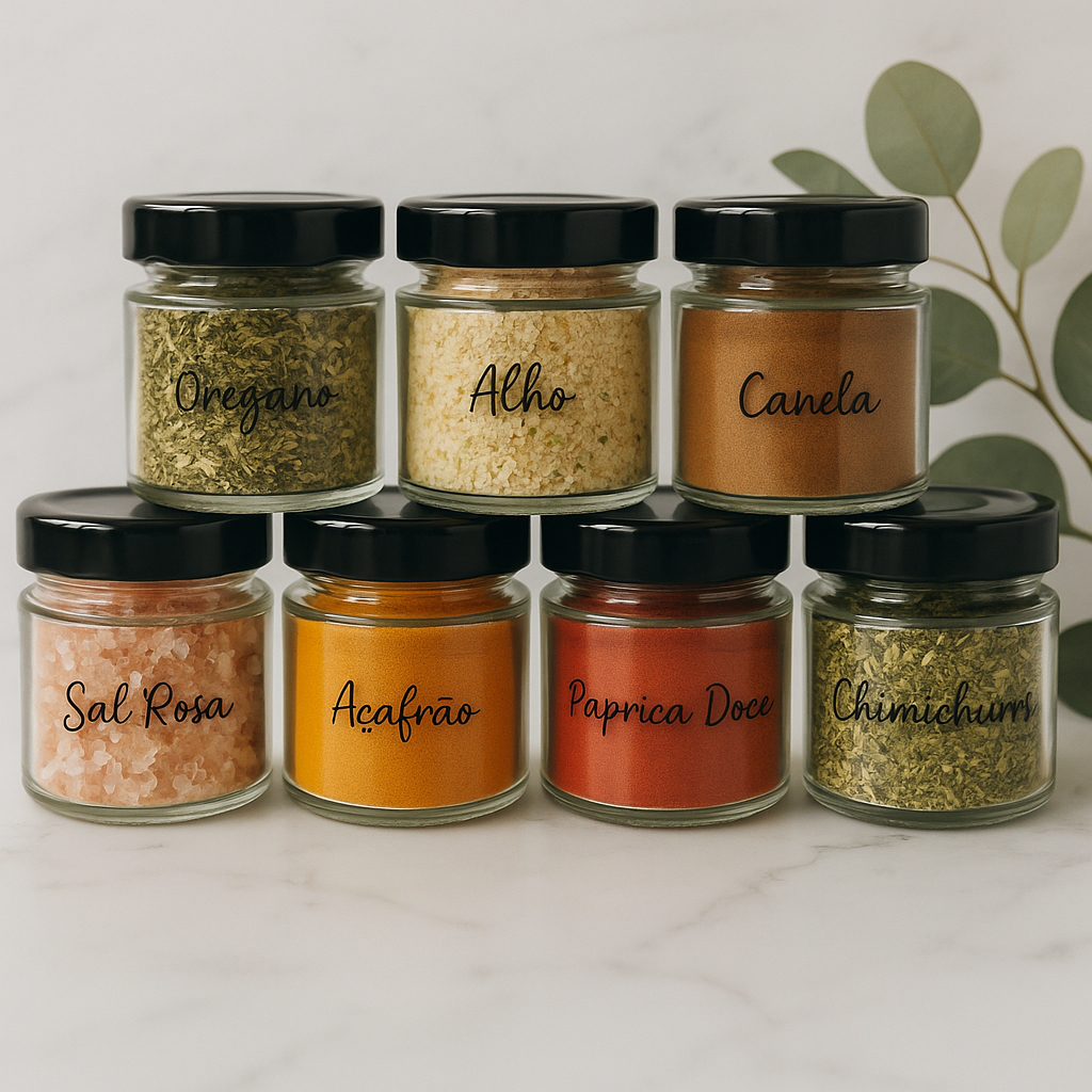 Kit 10 Porta Temperos Condimentos c/ 32 Adesivos de Temperos Potes de Vidro Organizador