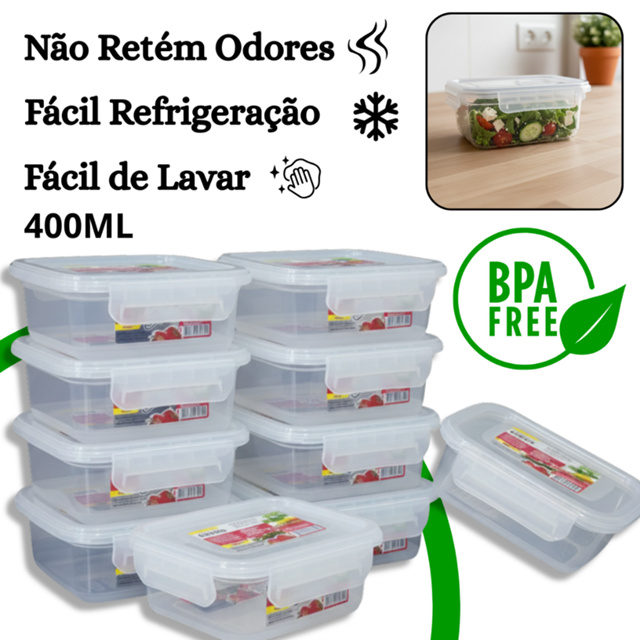 Kit 10 Pote Marmita Hermético 400ml Retangular Tampa com Trava Livre de BPA