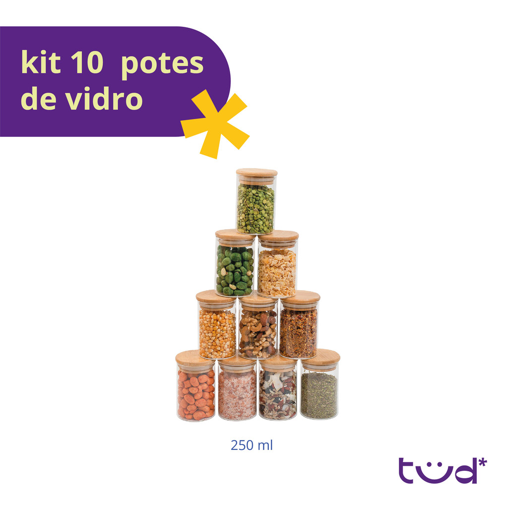 Kit 10 potes de vidro 250ml com tampa de bambu herméticos redondos - Tüd