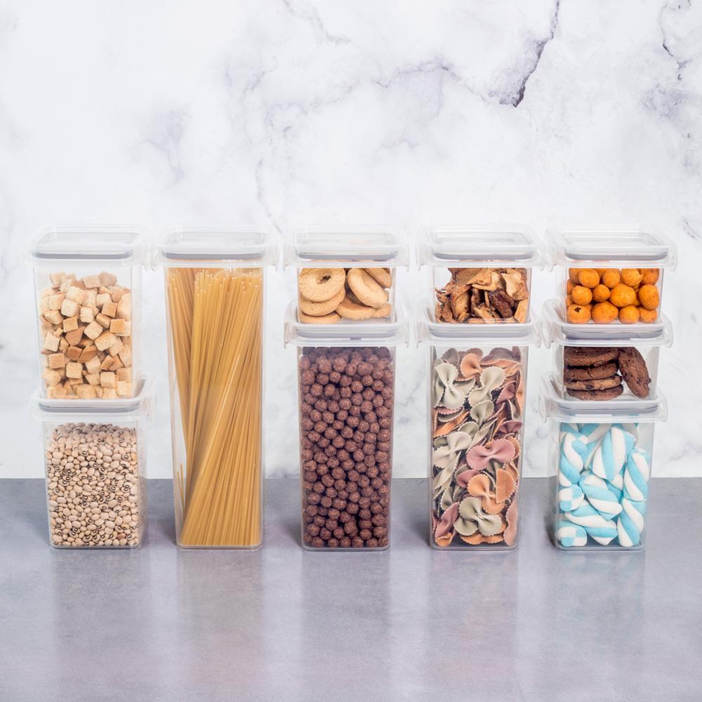 Kit 10 Potes Herméticos com Trava Quadrado Plástico Plasútil Dimensao: (Comp x Larg x Alt): 39,0x23,5x23,5 cm - Os conjuntos de potes herméticos da Plasútil são essenciais para organização da sua cozinha ou despensa. São fabricados em polipropileno (PP), atóxicos e livres de bisfenol-A (BPA FREE); Possuem diferencias que farão diferença no seu dia-a-dia e facilitarão sua rotina: - Tampa emborrachada que garante o fechamento hermético e conserva os alimentos frescos e crocantes por mais tempo. -Travas laterais que contribuem para um fechamento seguro. - Modulares: empilhamento entre bases semelhantes. Encaixe perfeito que otimiza espaço em armários e gavetas. - Tampa transparente facilita identificação do conteúdo. - Pode ser levado ao freezer, lava-louças e micro-ondas. - Composto por 10 potes (CxLxA): 4 x 380 ml (11,0x10,4x7,6 cm - QUADRADO BAIXO), 3 x 830 ml (11,0x10,4x14,4 cm - QUADRADO MÉDIO), 2 x 1,24 L (11,0x10,4x21,0 cm - QUADRADO ALTO) e 1 x 1,6 L (11,0x10,4x27,8 cm - QUADRADO ALTO)..