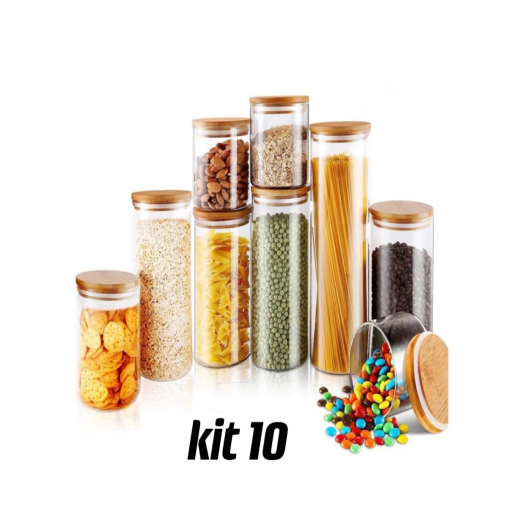 Kit 10 Potes vidro hermético para mantimentos tampa bambu 200 ml 250ml 300 ml 400 ml 500 ml 650 ml 800 ml 1000ml 1400 ml 1750 ml