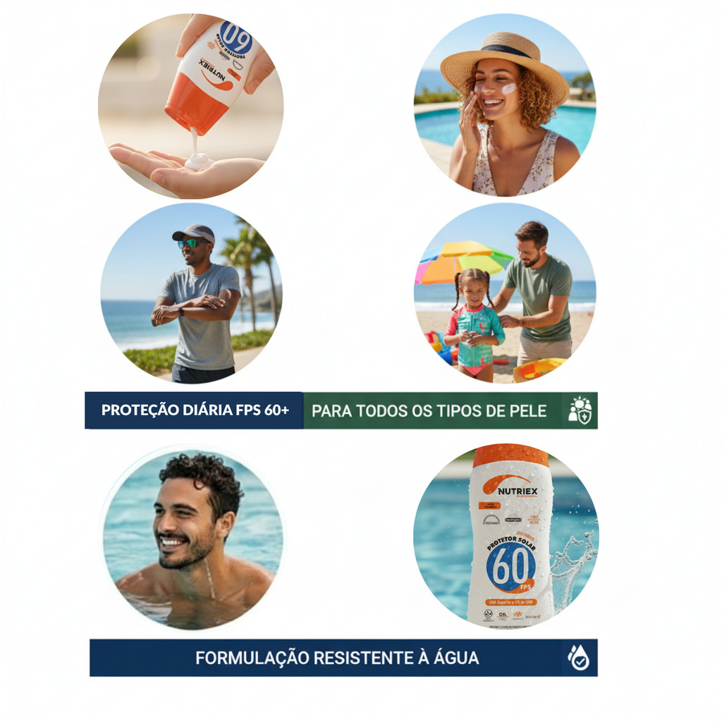 KIT Com 10 Protetor Solar Nutriex FPS 60 120ML O Protetor Solar Nutriex FPS 60 oferece proteção superior contra os efeitos nocivos do sol, desenvolvido com a avançada tecnologia Bioactive E®. Sua fórmula enriquecida com Vitamina E ajuda a prevenir o envelhecimento precoce, enquanto protege a pele dos raios UVA e UVB, com alta resistência à água e ao suor. Com toque seco, rápida absorção e fragrância suave, o protetor não deixa a pele esbranquiçada e proporciona conforto durante o uso. É hipoalergênico, oil free e não provoca acne, sendo indicado para todos os tipos de pele. Ideal tanto para uso diário quanto para atividades ao ar livre com alta exposição solar. Benefícios: * FPS 60 proteção solar intensiva contra queimaduras e danos causados pelo sol * Bioactive E® + Vitamina E ação antioxidante, previne envelhecimento precoce * Hipoalergênico e dermatologicamente testado * Oil Free não oleoso, não obstrui os poros * Não provoca acne * Rápida absorção e aplicação fácil * Fragrância suave * Não deixa a pele esbranquiçada * Muito resistente à água e ao suor * Proteção reforçada: UVA superior a 1/3 de UVB * Indicado para uso diário e exposição prolongada ao sol Modo de Aplicar: Aplique abundantemente sobre a pele antes da exposição solar. Reaplique sempre que necessário, especialmente após suar em excesso, nadar, se secar com toalha ou em períodos prolongados sob o sol. Para crianças menores de 6 meses, consulte um médico antes da utilização. Nuvem de Tags: Protetor Solar, Nutriex, Fps 60, Bioactive E, Vitamina E, Toque Seco, Uso Diário, Oil Free, Hipoalergênico, Não Oleoso, Não Provoca Acne, Resistente Água, Resistente Suor, Proteção Uva, Proteção Uvb, Alta Proteção Solar, Proteção Intensa, Rápida Absorção, Fragrância Suave, Não Esbranquiça, Cuidados Com A Pele, Anti Envelhecimento.