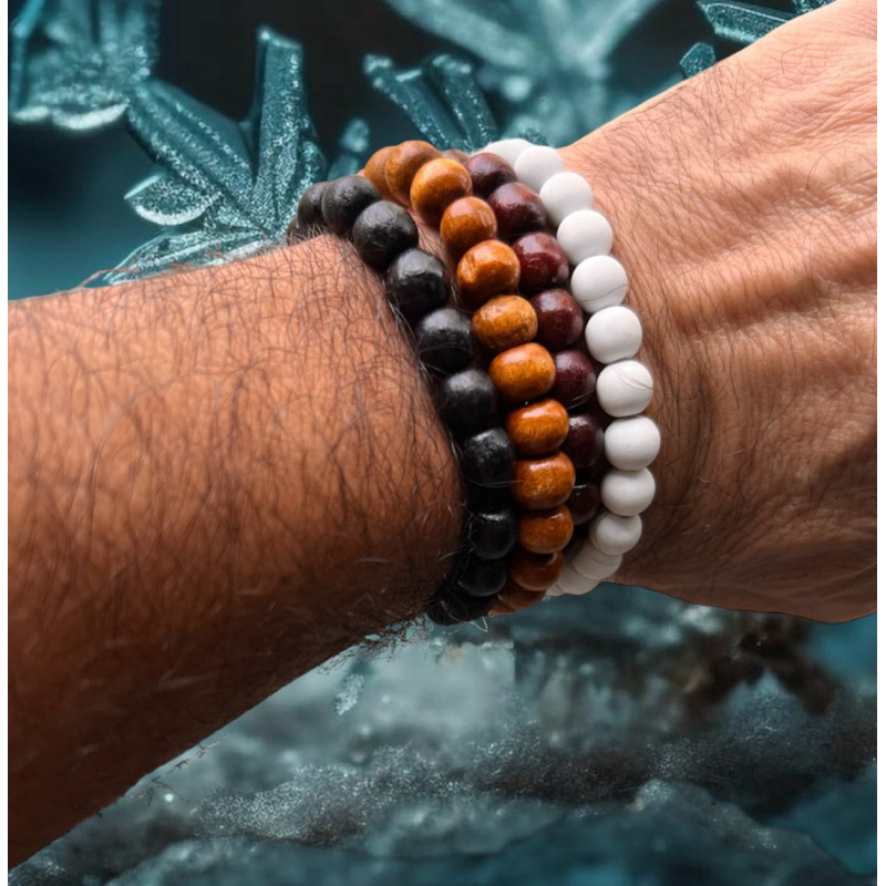 kit 10 pulseiras de bolinha de madeira masculina envio sortido tamanhos das bolinhas 8mm tamanho das pulseiras viam entre 18cm a 20cm de comprimento o envio acompanha 10 pulseiras de bolinha de madeira
