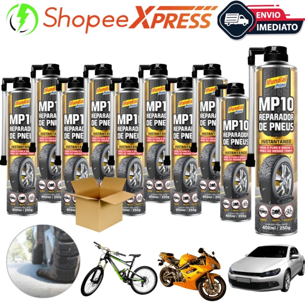 KIT 10 REPARADOR DE PNEUS 400ML MP10 MUNDIAL PRIME SPRAY REMENDO PNEU FURADO MOTO CARRO BIKE VEDA COM E SEM CÂMARA