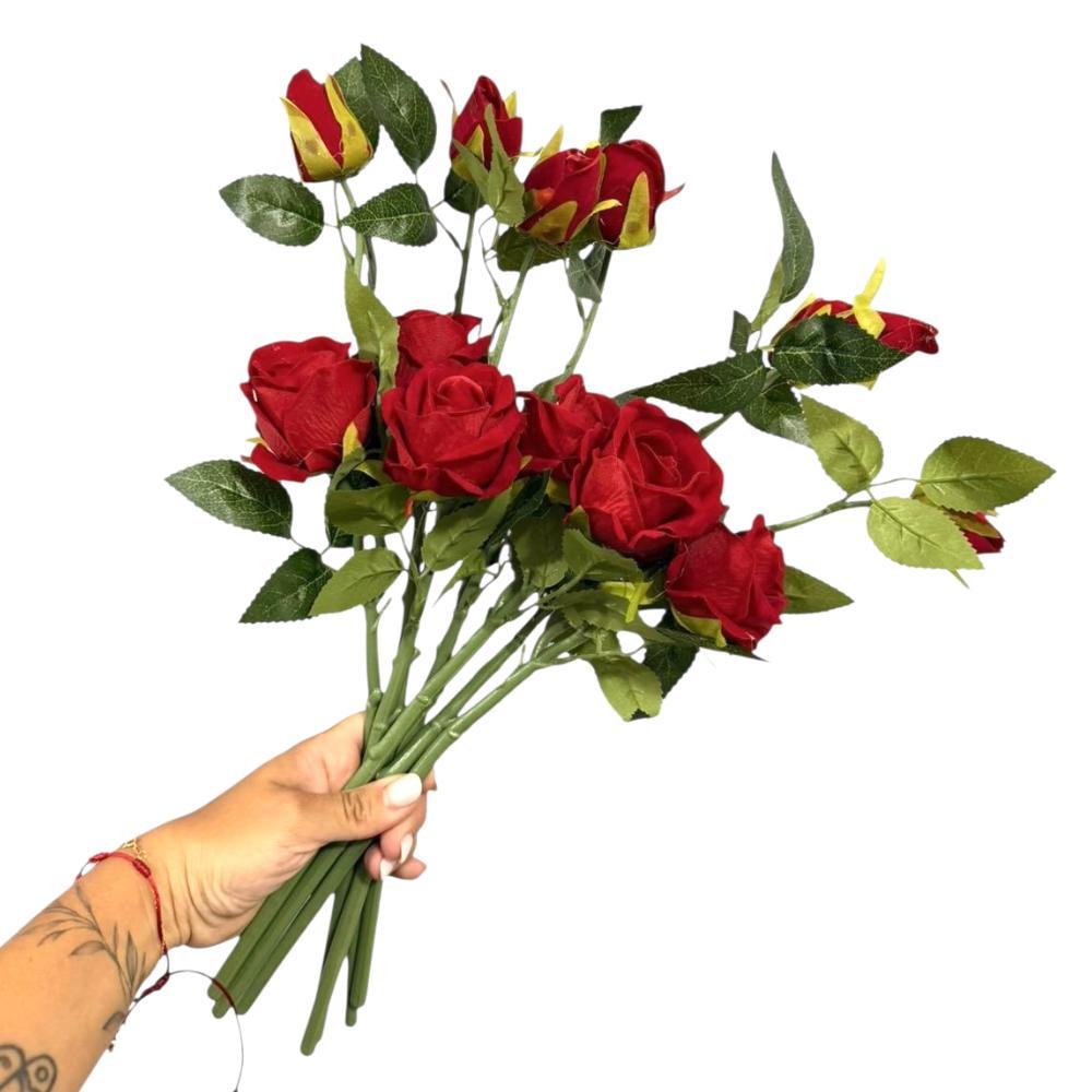 Kit 10 Rosas e Botão 40 cm Artificial Aveludada Vermelha Individual Decoração Arranjo Flor