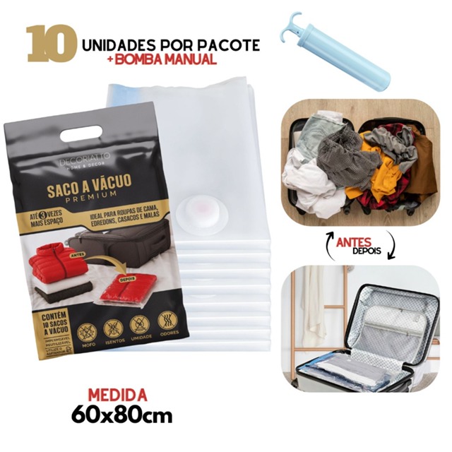 Kit 10 Saco a Vácuo 60x80cm com Bomba Manual Organizador p/ Mala Viagem Roupas Guarda Roupa Edredom