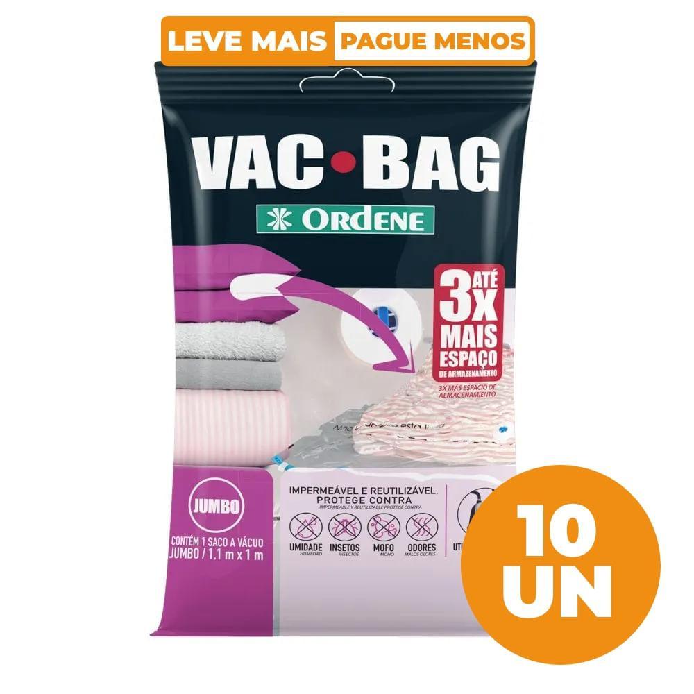 O Saco a Vácuo Organizador Jumbo Transparente 1,1 x 1m Vac Bag Ordene é o maior modelo da linha e possibilita a diminuição de volume de peças de roupas, sejam de vestuário, de cama. Para o armário, para o closet, ou para mala de viagem, o item permite a melhor organização e armazenamento dos seus itens. O ar no interior do saco pode ser retirado com aspirador de pó. Kit com 10 unidades.