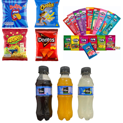 KIT 10 SALGADINHOS ELMA CHIPS + 10 SUCOS DEL VALLE + 10 FINIS SORTIDOS