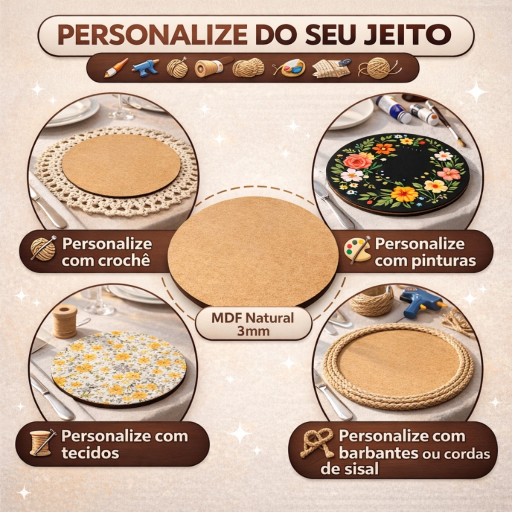 Kit 10 Sousplat Supla Mesa Posta Jogo Americano Artesanato Vários Tamanhos Mdf Cru 3mm Decorativo