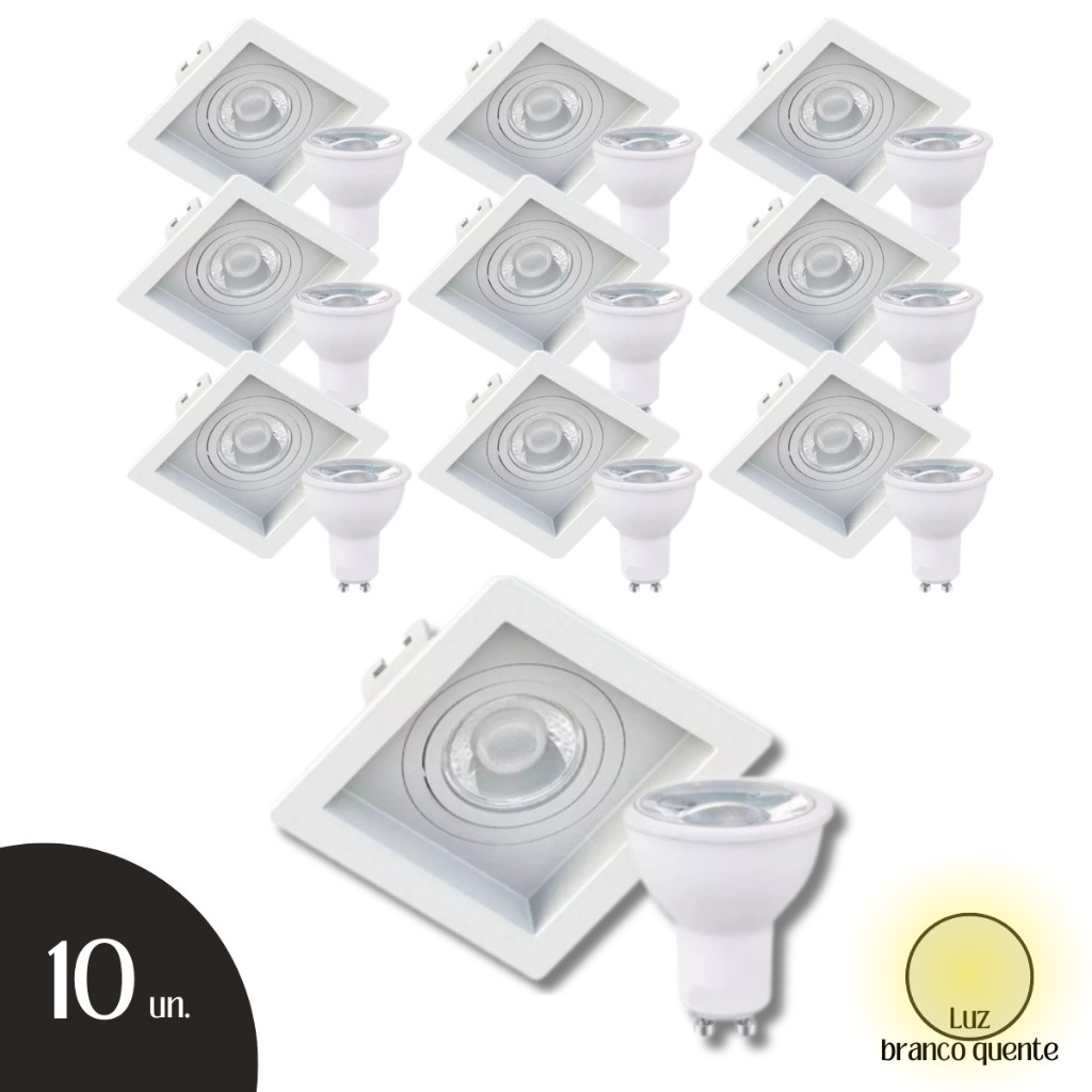 Kit 10 Spot Embutir Direcionável Quadrado Recuado Branco com Lâmpada Dicroica Led 7w MR16 GU10 BQ BF