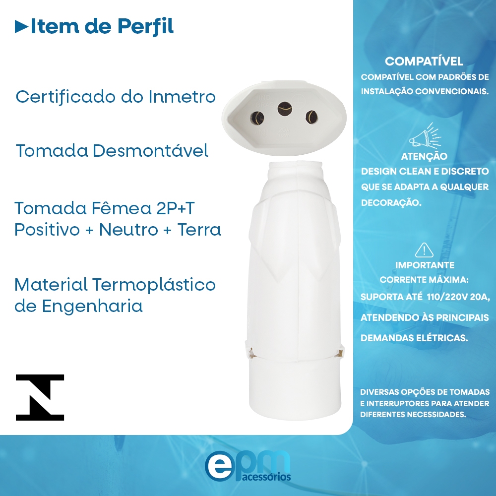 Tomada Fêmea 2p+t 20A e 10A Branco Desmontável Com Inmetro A Tomada Fêmea 2P+T 20A e 10A Branco Desmontável com Inmetro é a solução ideal para quem busca segurança, durabilidade e praticidade em instalações elétricas residenciais, comerciais ou industriais. Fabricada com materiais de alta qualidade, essa tomada oferece um design moderno e funcional, integrando-se perfeitamente a diferentes ambientes. Características do Produto: Compatibilidade: Suporta correntes de 10A e 20A, atendendo às necessidades de diversos aparelhos e equipamentos. Certificação Inmetro: Garantia de segurança e conformidade com as normas brasileiras. Desmontável: Facilita a instalação e manutenção, sendo prática para ajustes ou reposições. Cor Branca: Estética clean e elegante que combina com qualquer decoração. Durabilidade: Feita com materiais resistentes, proporcionando longa vida útil. Benefícios: Versatilidade: Ideal para ser utilizada em ambientes que demandam maior capacidade elétrica, como cozinhas, escritórios e áreas industriais. Instalação Simplificada: O modelo desmontável permite maior agilidade no processo de montagem. Segurança Garantida: Certificada pelo Inmetro, esta tomada oferece proteção contra falhas elétricas, promovendo tranquilidade no uso. A Tomada Fêmea 2P+T 20A e 10A Branco Desmontável com Inmetro é indispensável para instalações elétricas confiáveis e seguras. Adquira agora mesmo e tenha a qualidade que você merece em sua rede elétrica! Descrição do produto: Tomada Fêmea 2p+t (Positivo + Neutro + Terra) Produto com Certificado do Inmetro MR-OCP-0614/2022 Peças Desmontáveis Voltagem: Bivolt Amperagem: 10A e 20A (Conexão interna ajustável para 10A e 20A) Produto Novo Material: Termoplástico de Engenharia Cor: Branco Marca: EPM Acessórios Fabricante: FLP