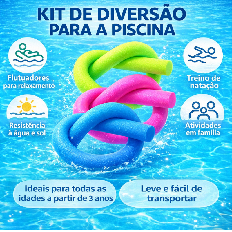 Kit 10 un Boia Espaguete Grande Macarrão Flutuador 1,65m Piscina Natação Cor Colorido Furado Transforme seus momentos na piscina, praia ou lago em pura alegria com este kit completo de boias espaguete coloridas! Feitas em polietileno de alta densidade, elas são leves, flexíveis, resistentes à água e ao sol, garantindo durabilidade e segurança para toda a família. Por que escolher nossas Boias Espaguete? - Ideal para família, amigos, festas na piscina ou atividades escolares - Cores sortidas vibrantes – amarelo, azul, verde, rosa e laranja - Material resistente – não deforma e possui ótima flutuação - Versáteis – perfeitas para relaxar, nadar, brincar ou usar em treinos aquáticos - A partir de 3 anos – diversão garantida para todas as idades - Fáceis de transportar – super leves e práticas para levar a qualquer lugar Usos recomendados: Atividades recreativas na piscina Treinos e aulas de natação Apoio para exercícios de hidroginástica Brincadeiras entre crianças Relaxamento na água Jogos em família na praia ou lago Dimensões: - Comprimento: 1,60 m - Espessura: padrão ideal para flutuação confortável - Perfeitas para o verão! Seja para curtir um dia ensolarado ou para garantir mais segurança nas brincadeiras aquáticas, este kit de boias espaguete é a escolha certa para quem busca diversão, praticidade e qualidade.
