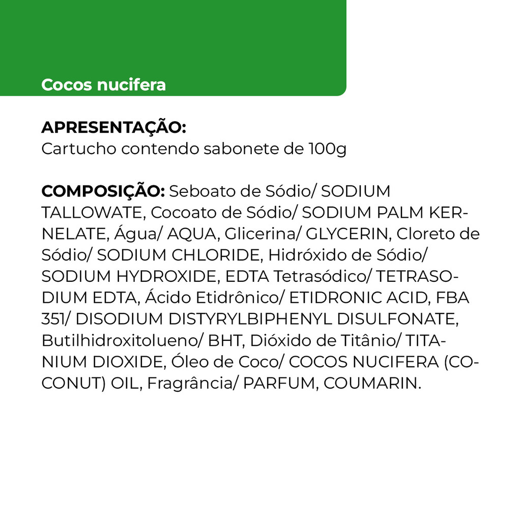 Kit 10 Und Sabonete de Coco Arte Nativa 100g MODO DE USO: Umedeça a pele e aplique o sabonete de Coco pelo corpo fazendo movimentos circulares com as mãos. Enxágue. Ideal para banhos. Recomenda-se o uso diário. FINALIDADE DE USO: Sabonete facial e/ou corporal. O sabonete em barra de COCO tem como principais componentes o óleo vegetal de palmiste e o óleo vegetal de coco, que combinado com os ativos emolientes, torna o sabonete ainda mais nutritivo e hidratante, que deixa sua pele limpa, macia e com um agradável aroma. Ideal para o cuidado diário da pele mista ou ressecada. CUIDADOS DE CONSERVAÇÃO: Mantenha a embalagem bem fechada e ao abrigo do calor excessivo. ADVERTÊNCIAS: Para uso externo apenas. Não ingerir. Mantenha fora do alcance de crianças. Em caso de contato com os olhos, enxágue abundantemente com água. Descontinue o uso em caso de sensibilização. Ingredientes de origem natural podem gerar variações na cor do produto, sem que haja alterações nas suas propriedades. COMPOSIÇÃO: Seboato de Sódio/ SODIUM TALLOWATE, Cocoato de Sódio/ SODIUM PALM KERNELATE, Água/ AQUA, Glicerina/ GLYCERIN, Cloreto de Sódio/ SODIUM CHLORIDE, Hidróxido de Sódio/ SODIUM HYDROXIDE, EDTA Tetrasódico/ TETRASODIUM EDTA, Ácido Etidrônico/ ETIDRONIC ACID, FBA 351/ DISODIUM DISTYRYLBIPHENYL DISULFONATE, Butilhidroxitolueno/ BHT, Dióxido de Titânio/ TITANIUM DIOXIDE, Óleo de Coco/ COCOS NUCIFERA (COCONUT) OIL, Fragrância/ PARFUM, COUMARIN. Registro M.S.: Nº do Processo: 25351.036181/2020-13 – Cosmético Grau 1 Aut. Func.: 2.04.396-1