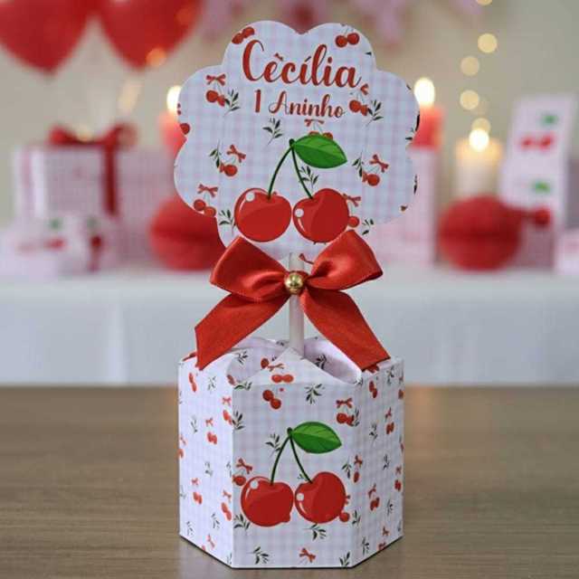 kit 10 Unidades Centro de Mesa Cerejinha Personalizado Chá Aniversário Festa