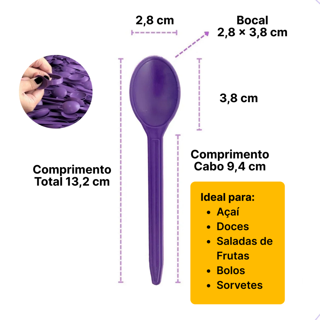 A colherzinha perfeita para quem vende açaí, sorvete e sobremesas geladas. Fabricada em plástico resistente, ela não entorta e garante uma experiência mais confortável para o cliente — ideal para uso profissional em açaíterias, sorveterias, lanchonetes, cafeterias, food trucks e delivery. CARACTERÍSTICAS: - Material: Plástico PP altíssima qualidade - Comprimento total: 13,2cm - Comprimento apenas do cabo: 9,4cm - Medidas do bocal: 2,8 x 3,8cm - Cor: Roxa