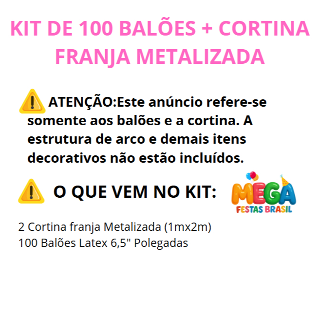 🥇 Produto à Pronta Entrega 🚛 (Enviamos) sua compra em até 24h 🔥O ENVIO MAIS RÁPIDO DA SHOPEE! PRODUTO NO BRASIL!🔥 🎉 KIT DE 100 BALÕES + 2 CORTINA FRANJA METALIZADA 🎈✨ Perfeito para criar decorações modernas e elegantes em aniversários, casamentos e festas especiais. ✨ O que vem no kit: -01 cortina franja metalizada (1m x 2m) Pink -01 cortina franja metalizada (1m x 2m) Azul -50 balões látex 6,5" polegadas Azul Claro -50 balões látex 6,5" polegadas Rosa Claro ⚠️ Atenção: Este anúncio refere-se somente aos balões e à cortina. A estrutura de arco e demais itens decorativos não estão incluídos. 🎊 Crie um cenário incrível e fotos inesquecíveis com esse kit prático e sofisticado!