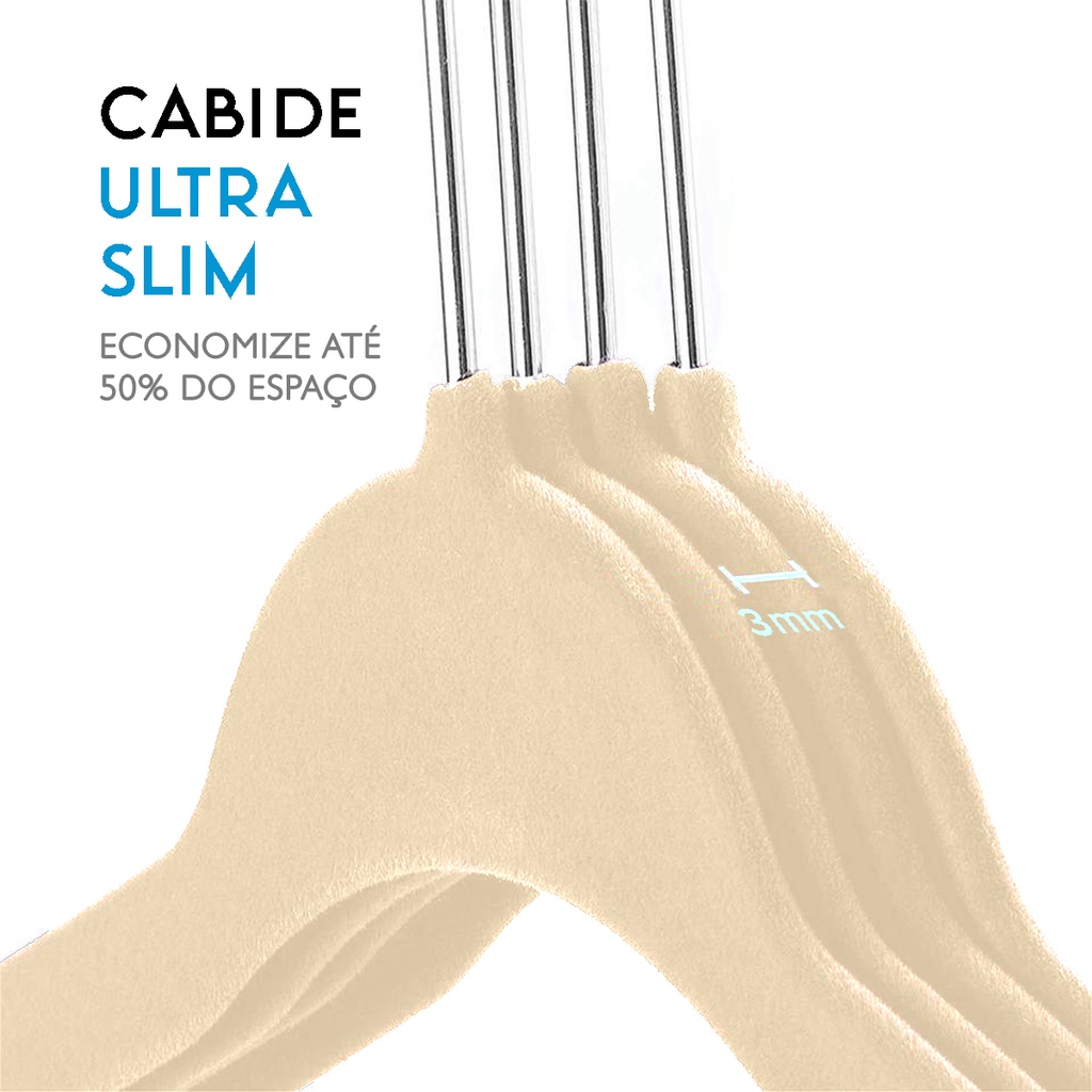 Kit 100 Cabides De Veludo Slim Antideslizante *SOBRE O CABIDE* O cabide bege de veludo Slim é uma peça de organização e armazenamento elegante projetada para pendurar roupas de forma eficiente e cuidadosa. O cabide possui um design esbelto e minimalista, otimizado para economizar espaço em seu armário ou closet. Ele é construído com uma estrutura fina e resistente, feita de materiais duráveis ??de alta qualidade, garantindo que suas roupas fiquem penduradas com segurança e sem deformações. *CARACTERÍSTICAS* Uma característica distintiva do cabide é o revestimento de veludo bege que cobre a superfície da estrutura. Esse material macio e luxuoso não apenas evita que as roupas escorram, mas também oferece uma camada suave de proteção para evitar quebras e vincos indesejados. Além disso, o veludo confere uma aparência sofisticada e agradável ao toque, acrescentando um toque de proteção ao espaço onde o cabide é utilizado. Na parte superior do cabide, há um gancho giratório em metal cromado, que permite fácil ao pendurar ou retirar roupas do armário. Esse gancho também é forte o suficiente para sustentar o peso das roupas, mantendo o cabide seguro e estável. Suas extremidades curvadas e arredondadas ajudam a manter a integridade das peças de vestuário, preservando suas formas originais e evitando marcas indesejadas. *MEDIDAS UNIDADE CABIDE* ALTURA: 22,5 CM ESPESSURA: 4 MM COMPRIMENTO: 45CM PESO:100G