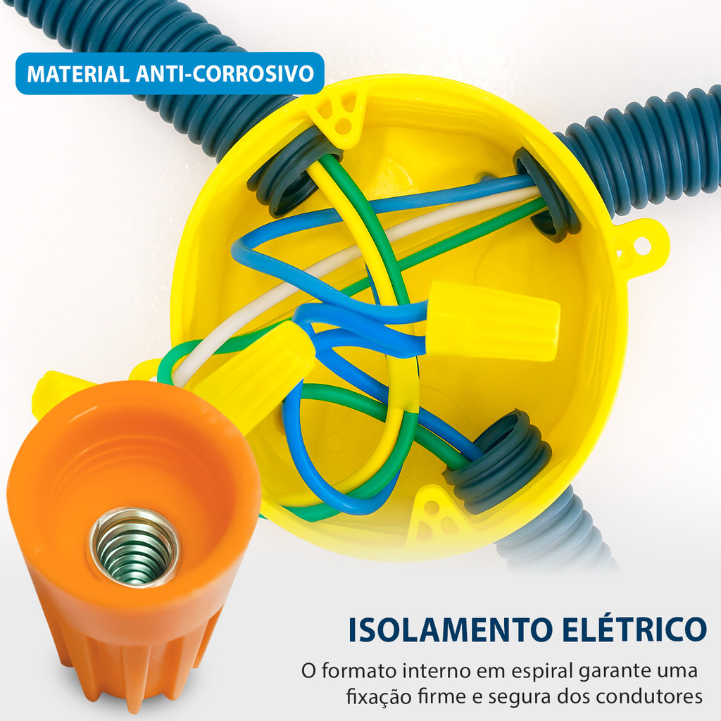 CONECTOR TORÇÃO DE EMENDA RÁPIDA • Os conectores de torção são projetados para emendar cabos flexíveis e fios rígidos de maneira prática e segura. • Com uma capa isolante, possuem uma mola interna que se expande para acomodar e manter os condutores firmemente unidos sob pressão constante, sem causar danos. ( SELECIONE O KIT DESEJADO) • 100un | Conector Torção de Emenda Rápida 0,8² a 3mm² - Cinza • 100un | Conector Torção de Emenda Rápida 0,8² a 4,5mm² - Azul • 100un | Conector Torção de Emenda Rápida 0,8² a 5.7mm² - Laranja • 100un | Conector Torção de Emenda Rápida 0,8 á 10,5mm - Amarelo • 100un | Conector Torção de Emenda Rápida 0,8 á 20mm - Vermelho ESPECIFICAÇÕES: • Possui corpo em Polipropileno (PP), material reutilizável e retardante de chama; • Indicado para conectar e isolar fios ou cabos elétricos de baixa tensão; • Suporta altas temperaturas, sendo até 105ºc; • Aplicação em cabos e fios desemcapados; • Voltagem máxima de 300 volts. OBSERVAÇÃO: • Para saber se está comprando as medidas corretas, saiba a medida dos fios unidos! DIMENSÕES: • Largura: 9mm (0,9cm); • Altura: 15mm (1,5cm).