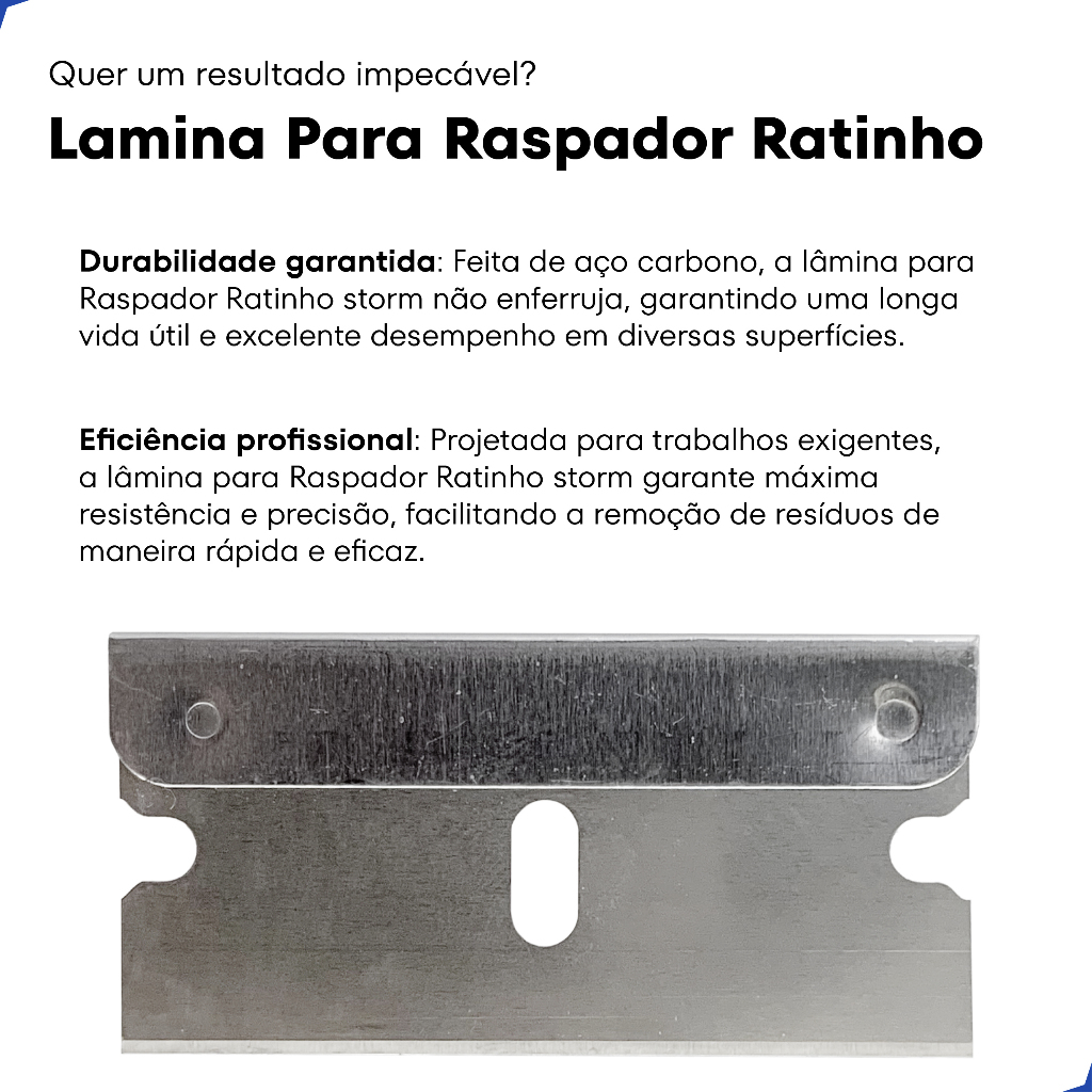 A lâmina do Raspador Ratinho é o coração desta ferramenta de limpeza versátil, projetada para oferecer precisão transformadora em cada detalhe. Com sua geometria afiada e estrategicamente posicionada, a lâmina desliza suavemente sobre superfícies diversas, desde vidro até metal, proporcionando uma remoção eficiente de tintas, colas e adesivos. O material da lâmina, resistente e durável, garante uma longa vida útil, mantendo sua afiação ao longo do tempo. Esta lâmina é especialmente formulada para resistir ao desgaste constante, mantendo-se afiada para enfrentar os desafios diários da limpeza profissional. Cada movimento do Raspador Ratinho com sua lâmina é um gesto de precisão, garantindo resultados consistentes e detalhes impecáveis. Ao escolher a lâmina para Raspador Ratinho, você está investindo em qualidade e confiança. Desenvolvida para profissionais que valorizam a excelência em limpeza, esta lâmina é a aliada perfeita para transformar superfícies e destacar-se em cada aplicação. Experimente o poder da precisão com a lâmina do Ratinho de Plástico e eleve o padrão das suas atividades de limpeza. - Características gerais: • Composição: Aço Carbono • Não enferruja com o tempo de uso • Para limpeza de vidros antes da instalação de insulfilm - Aplicação: • Lâminas para Raspador Ratinho. - Dimensões aproximadas: • Altura: 2 cm • Largura: 4 cm - Conteúdo da embalagem: • 100 x Lâminas para Raspador Ratinho Garantia de Fábrica: 03 meses de garantia contra defeitos de fabricação. OBS: As cores das imagens podem variar de acordo com as configurações do seu monitor. ATENÇÃO: As compras realizadas em nome de Pessoa Jurídica (CNPJ) estarão sujeitas à cobrança de ICMS SUBSTITUIÇÃO TRIBUTÁRIA de acordo com a legislação vigente ao estado adquirente da mercadoria.