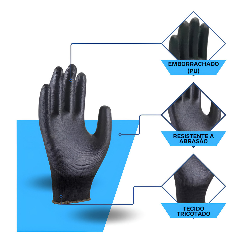 Kit 100 Luva De Segurança Multitato Tatil Banhada Luva Pu Black P M G GG Mecanico Pedreiro Eletricis