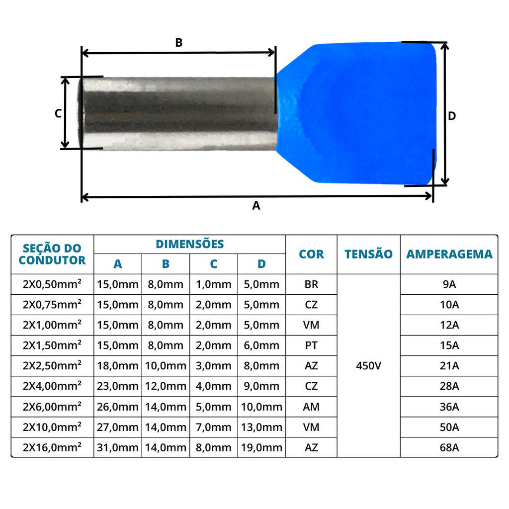 Kit 100 Terminal Tubular Ilhós 2,5mm Duplo Pre isolado Tubo Conector Elétrico para Cabos e Fios Azul