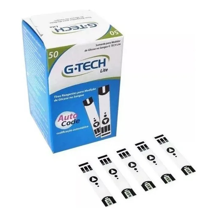 Kit 100 tiras (2 caixas). Tiras para medidor gtech lite com 50 unidades. As tiras de teste g-tech lite possuem a tecnologia fast draw, sistema que permite um aproveitamento total da amostra de sangue, de forma rápida, independente da posição. A enzima gdh-fad contida na tira proporciona uma medição altamente precisa e oferece as seguintes vantagens: elimina interferentes como açúcares diferentes da glicose, oxigenoterapia, entre outros, que alteram o resultado de tiras que utilizam outras enzimas como god e gdh-pqq. É mais resistente à temperatura e oxidação do ar. Pode utilizar sangue venoso, arterial ou capilar,=. -ATENÇÃO - Essas tiras SERVEM SOMENTE para o medidor de glicose no sangue G-TECH LITE e G-TECH LITE SMART. Essas tiras serão COMPATÍVEIS APENAS se tiver escrito "LITE" na frente ou atrás do aparelho.