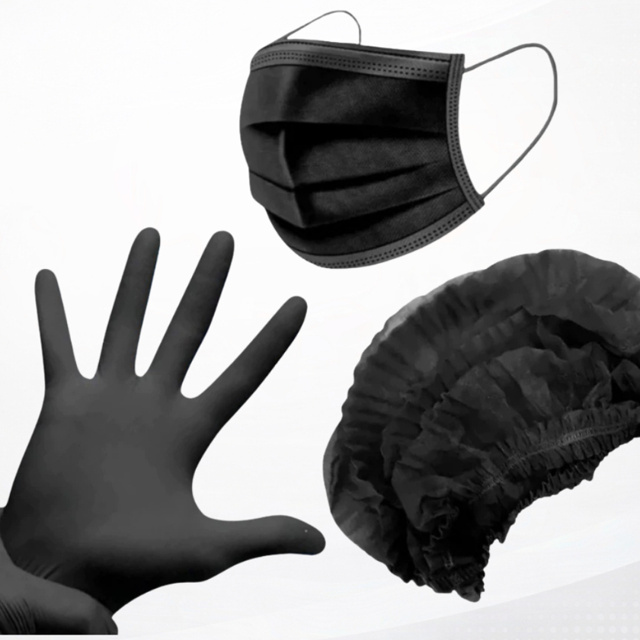 Kit 100 Toucas TNT+ 100 Luvas Nivyl P, M,G +100 Máscara Descartável Preta C/ Clipe Nasal
