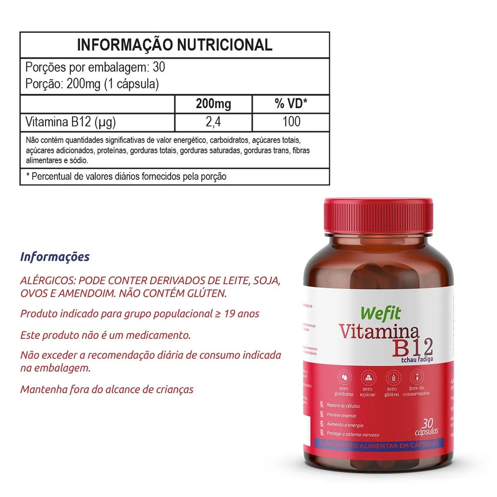 Kit 100% Whey Refil 900g Max Titanium + Vitamina B12 C/30 Cápsulas WeFit Sobre o produto: Este combo une performance e vitalidade em uma solução prática e eficaz. O 100% Whey Max Titanium é um suplemento proteico de alto valor biológico, ideal para quem busca ganho de massa muscular, recuperação e definição. Já a Vitamina B12 WeFit complementa sua rotina com suporte ao metabolismo energético, saúde neurológica e combate ao cansaço. Juntos, eles potencializam seus treinos e sua qualidade de vida. Como usar: 100% Whey Max Titanium: Diluir 30g (2 dosadores) em 200ml de água ou bebida de sua preferência. Consumir uma vez ao dia ou conforme orientação de nutricionista ou médico. Vitamina B12 WeFit: Ingerir 1 cápsula ao dia, preferencialmente com uma refeição. Benefícios: - 100% Whey Max Titanium: - 23g de proteína por dose - Rico em BCAA e aminoácidos essenciais - Promove a recuperação e o crescimento muscular - Alta absorção e digestibilidade Vitamina B12 WeFit: - Contribui para o metabolismo de energia - Auxilia na formação de glóbulos vermelhos - Suporte à saúde mental e ao sistema nervoso - Ajuda na redução do cansaço e da fadiga Alergênicos: 100% Whey Max Titanium: Contém derivados de leite e soja. Pode conter ovo e amendoim. Vitamina B12 WeFit: Pode conter leite, soja, ovos e amendoim. Ambos não contêm glúten. Ingredientes: 100% Whey Max Titanium: Proteína concentrada do soro do leite (WPC), aromatizantes, emulsificantes, edulcorantes (variam conforme o sabor). Vitamina B12 WeFit: Cianocobalamina, cápsula de gelatina, estabilizantes e antiumectantes. Advertências: - Uso adulto. - Não exceder a recomendação diária. - Este produto não é um medicamento. - Manter fora do alcance de crianças. - Contraindicado para gestantes, lactantes e crianças. - Consulte um profissional de saúde antes do uso em caso de doenças ou uso de medicamentos. Conclusão: O Kit 100% Whey Max Titanium + Vitamina B12 WeFit oferece uma combinação inteligente para quem busca força, foco e disposição. Um apoio completo para sua rotina de treinos e bem-estar.