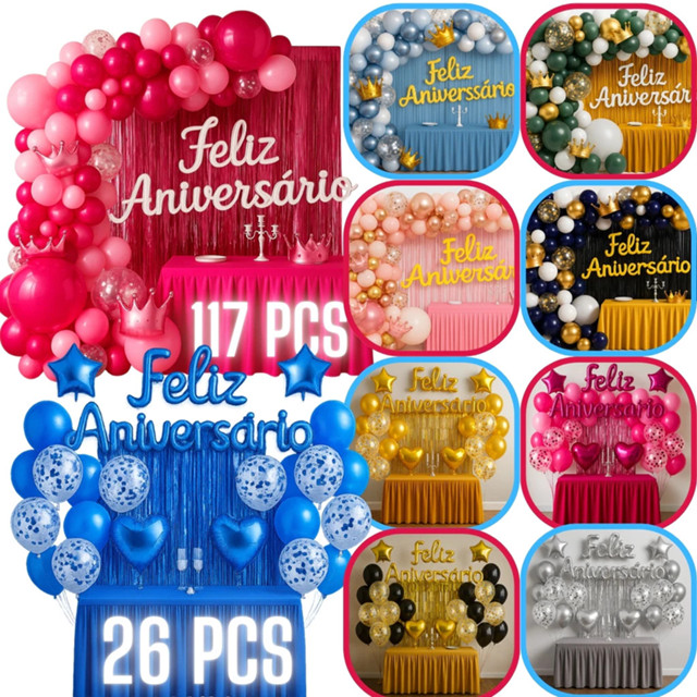 | Kit 117 Pcs Balão Feliz Aniversario Cortinas Toalha Bexigas Festa D... | R$ 29,99 | 25% | 4.8/5 | 888 |