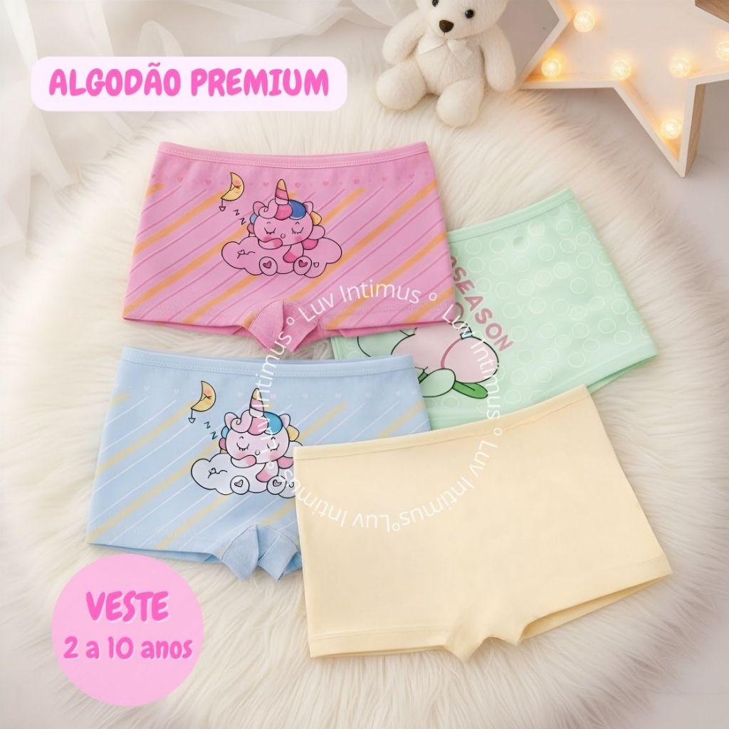 Kit 12,10 ou 3 Calcinhas Boxer Infantil Algodão Premium Menina 2 a 10 Anos