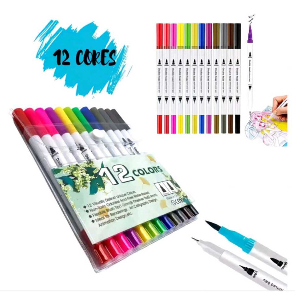 - Seja Bem vindo(a) a loja Monica Acessórios !!!!!!!!!!!!!!!!!! ***ATENÇÃO VARIAÇÃO DE QUANTIDADES*** * 12 CANETAS * 24 CANETAS * 36 CANETAS * 48 CANETAS -Caneta hidrográfica com Duas Pontas: Brush Pen e Fineliner. -Caneta hidrográfica com ponta pincel. Flexível, ideal para lettering, permite uma ótima modulação entre o traço grosso e o fino na caligrafia, Bom para lembrencinha de aniversario,material escolar/papelaria/caneta para colorir -A ponta da brush pen é diferenciada das demais disponíveis no mercado que são de fibra. Ela é de poliéster e totalmente flexível, muito semelhante a um pincel, possibilitando resultados diferenciados. -Caneta dual brush pen - Ponta pincel - Ponta fina 0.4 mm - Tinta à base de água - Marcador artístico - Uso artístico e profissional - Não tóxico - Linha Prime
