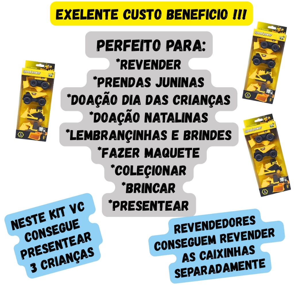 Olá, hoje iremos apresentar um super kit que ficou com um excelente custo beneficio, tornando-o uma excelente opção para comerciantes lojista e revendedores e também para quem quer comprar por atacado para doações brindes lembrancinhas de aniversario etc... Trata se do kit com 12 carros e tratores de construção a fricção Perfeito para revender e presentear pois esse kit é composto de 3 caixas com 4 carrinhos em cada, possibilitando revender separadamente e presentear até 3 crianças Descubra o emocionante mundo da construção com o Kit 12 Carrinhos de Construção. Este conjunto inclui uma variedade de veículos de construção, como tratores, escavadeiras, caminhões basculantes e retroescavadeiras, todos projetados para estimular a imaginação e a criatividade das crianças. Com um design robusto e feito de plástico durável, cada carrinho possui dimensões de 8 cm de comprimento, 5 cm de largura e 5 cm de altura, tornando-os perfeitos para as pequenas mãos. Recomendado para crianças a partir de 3 anos, este conjunto é ideal para brincadeiras em grupo ou para colecionar, proporcionando horas de diversão. Os veículos são movidos por fricção, permitindo que as crianças brinquem sem a necessidade de pilhas. Este produto é uma excelente opção para presentear, promovendo o desenvolvimento motor e a coordenação, enquanto as crianças exploram o fascinante universo da construção. # Brinquedo carro construção, carrinho construção brinquedo trator miniatura trator escavadeira retroescavadeira caminhão caçamba caminhão basculante, brinquedo infantil carro miniatura infantil brinquedo menino menina brinquedo por atacado para lembrancinha de festas aniversários brinquedo prenda atacado brinquedo doação dia das crianças brinquedo presente natal kit brinquedo de construção atacado