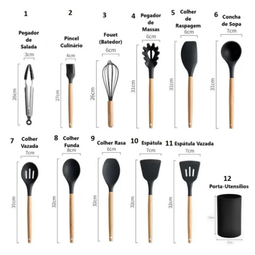 Neste Incrível Kit você recebe: 1- Colher Escumadeira 1- Espátula Sólida 1- Colher para Servir 1- Espátula Vazada 1- Colher Raspadora 1- Espátula Raspadora 1- Pegador de Macarrão 1- Concha de Sopa 1- Pincel Culinário 1- Pinça Pegador 1- Fouet Batedor 1- Suporte em Cilindro Kit Completo de Utensílios para Cozinha em Silicone que não danificam suas panelas e trazem total beleza para sua cozinha, realmente a qualidade é incrível. O cabo é bem rígido para ter segurança e praticidade no manuseio e preparo de receitas. Suportam altas temperaturas até 230ºC. Fácil de limpar e guardar. Conjunto excelente para o seu dia a dia. Super Conjunto com 12 utensílios, fabricação de alto nível, todos os itens são super resistentes, use com total tranquilidade, ganhe agilidade para preparar suas refeições e servir seus convidados. - Itens em silicone, podem ficar apoiados na panela direto no fogão, pois suportam altas temperaturas até 230ºC. - Não riscam suas panelas - Super fácil de limpar e no tamanho ideal para guardar em seu armário ou até mesmo pendurar na sua parede (Suporte não incluso). - Fabricação de alto nível, resistência e durabilidade garantida - Super Lindo com design perfeito para preparar e servir suas receitas - Podem ir na lava-louças - Livre de BPA
