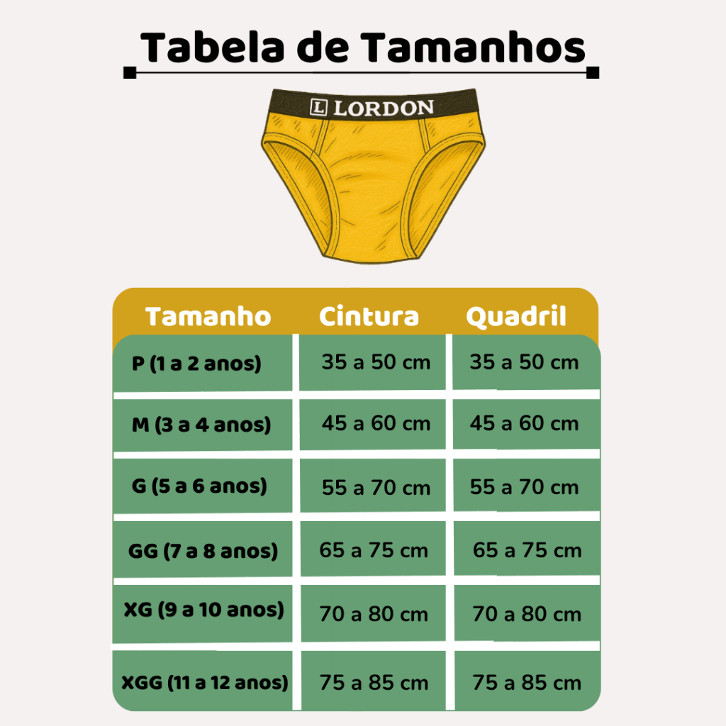Cueca Infantil Slip de Microfibra com Elástico Exposto – Estilo e Conforto Todos os Dias! Leve, prática e cheia de personalidade, a cueca slip infantil com elástico aparente é perfeita para o dia a dia das crianças. Produzida em microfibra macia e com toque geladinho, ela veste super bem, não incomoda e acompanha todos os movimentos com liberdade! O elástico exposto dá um toque moderno ao visual, além de ser resistente e confortável — não enrola e não aperta. Um kit indispensável pra garantir conforto e durabilidade na rotina dos pequenos! Destaques do produto: - Tecido leve, respirável e que seca rápido - Elástico firme e confortável na cintura - Modelagem slip anatômica - Ideal para o uso diário - Cores Sortidas - Acabamento reforçado para maior durabilidade Composição: 93% Poliéster | 7% Elastano TABELA DE TAMANHOS: P – 1 a 2 anos | Cintura: 35 a 50 cm | Quadril: 35 a 50 cm M – 3 a 4 anos | Cintura: 45 a 60 cm | Quadril: 45 a 60 cm G – 5 a 6 anos | Cintura: 55 a 70 cm | Quadril: 55 a 70 cm GG – 7 a 8 anos | Cintura: 65 a 75 cm | Quadril: 65 a 75 cm XG – 9 a 10 anos | Cintura: 70 a 80 cm | Quadril: 70 a 80 cm XGG – 11 a 12 anos | Cintura: 75 a 85 cm | Quadril: 75 a 85 cm Kit com 12 unidades sortidas! Produção Própria | Qualidade Garantida! Pronta entrega | Envio imediato para todo o Brasil!