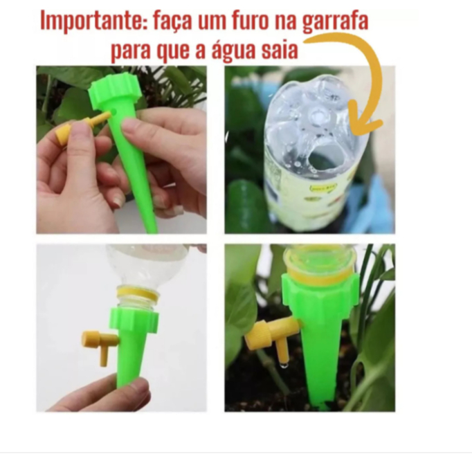 Kit 12 Gotejadores para planta automatico, garrafas Pet Com esse gotejador de plantas, voce podera viajar com tranquilidade sabendo que suas verdinhas receberao agua. Regule a velocidade do gotejamento de acordo com suas necessidades. Acopla com garrafas PET com bocal de 2,5 cm Tamanho do gotejador: Altura 13 cm Largura 3 cm ENVIADO COR : VERDE